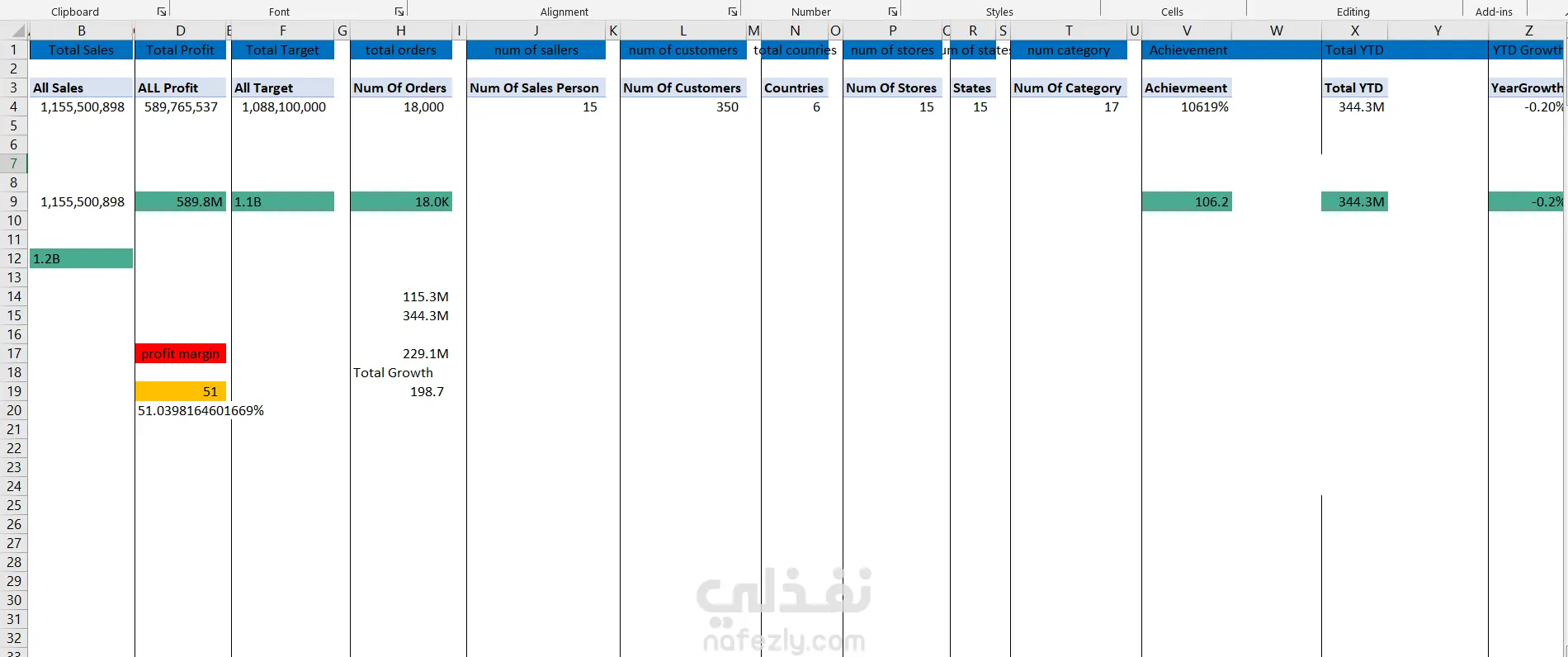 الهدف من الداشبورد هو توفير رؤية شاملة لأداء الشركة عبر عدة محاور (Sales – Targets – Regions – Stores – Customers – Categories).