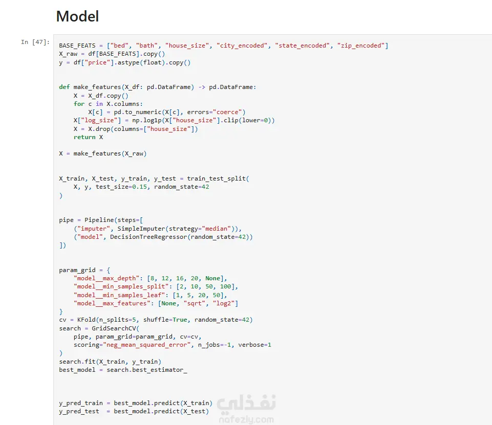 توقع أسعار العقارات السكنية باستخدام خط أنابيب scikit-learn وشجرة قرار محسّنة. يشمل استبدال القيم المفقودة بالوسيط + هندسة ميزات log1p، والتحقق المتقاطع 5 مرات (MAE/RMSE/R²)، والتشخيصات البصرية (المتبقيات، أهم الميزات، توزيعات CV).