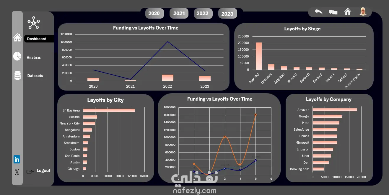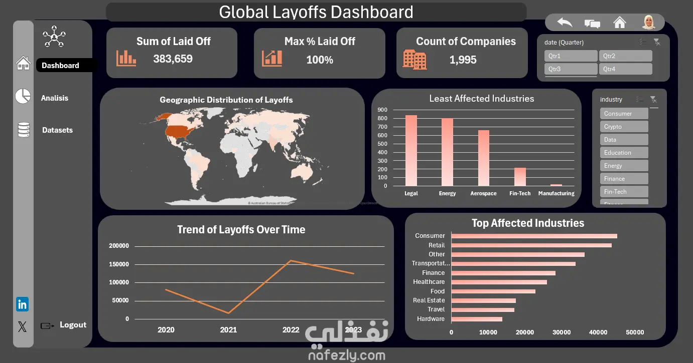 Developed an interactive dashboard using data from 1,995 companies and over 383,000 laid-off employees, providing a clear view of industry impact, geographic distribution, and layoff trends over time with dynamic data exploration