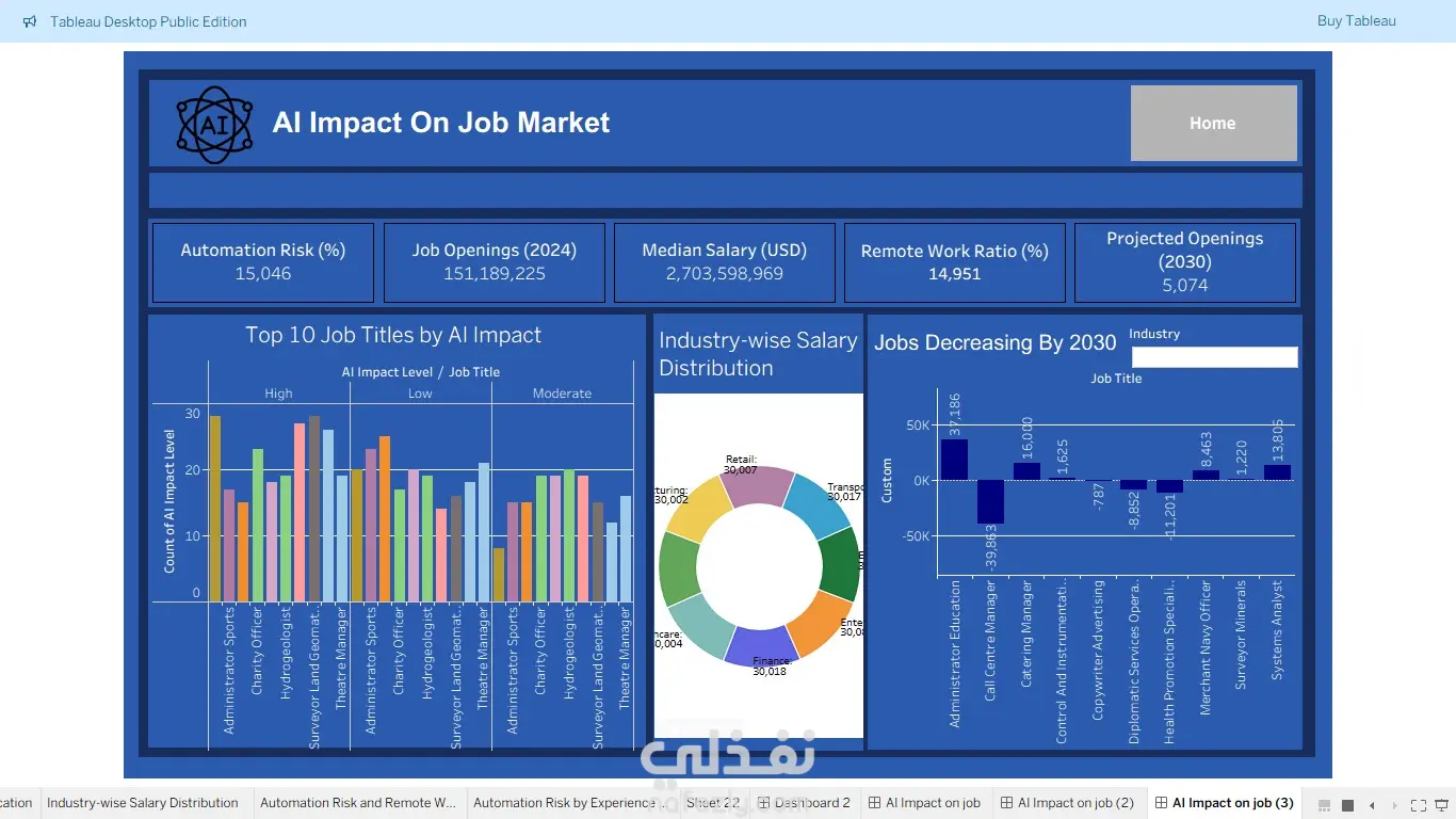 This project analyzes how artificial intelligence is transforming the job market by examining changes in job demand, required skills, and employment trends across different sectors. The analysis involves collecting and cleaning data from reports, job platforms, and studies, then identifying patterns related to automation-affected roles and emerging AI-driven jobs. The project provides insights to help organizations and individuals understand future workforce needs, highlighting the most in-demand skills and offering data-driven recommendations through visual dashboards and statistical analysis.