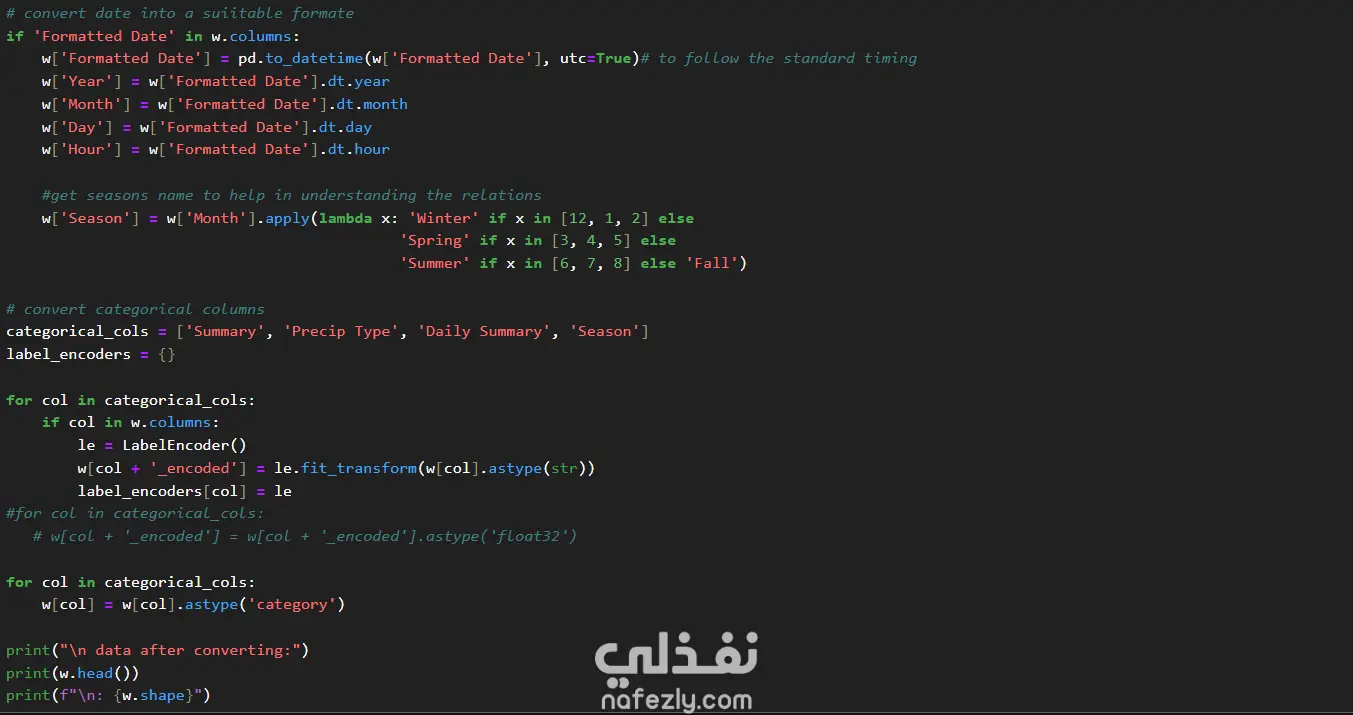 يقدم المشروع تحليلًا شاملاً لبيانات الطقس، يشمل تنظيف البيانات واستكشافها بصريًا، ثم تطبيق نماذج تصنيف وانحدار للتنبؤ بدرجة الحرارة وتحديد إذا كانت أعلى من المتوسط. تمت مقارنة أداء خوارزميات مختلفة مثل Logistic Regression وKNN وDecision Tree وNeural Network للوصول لأفضل نموذج