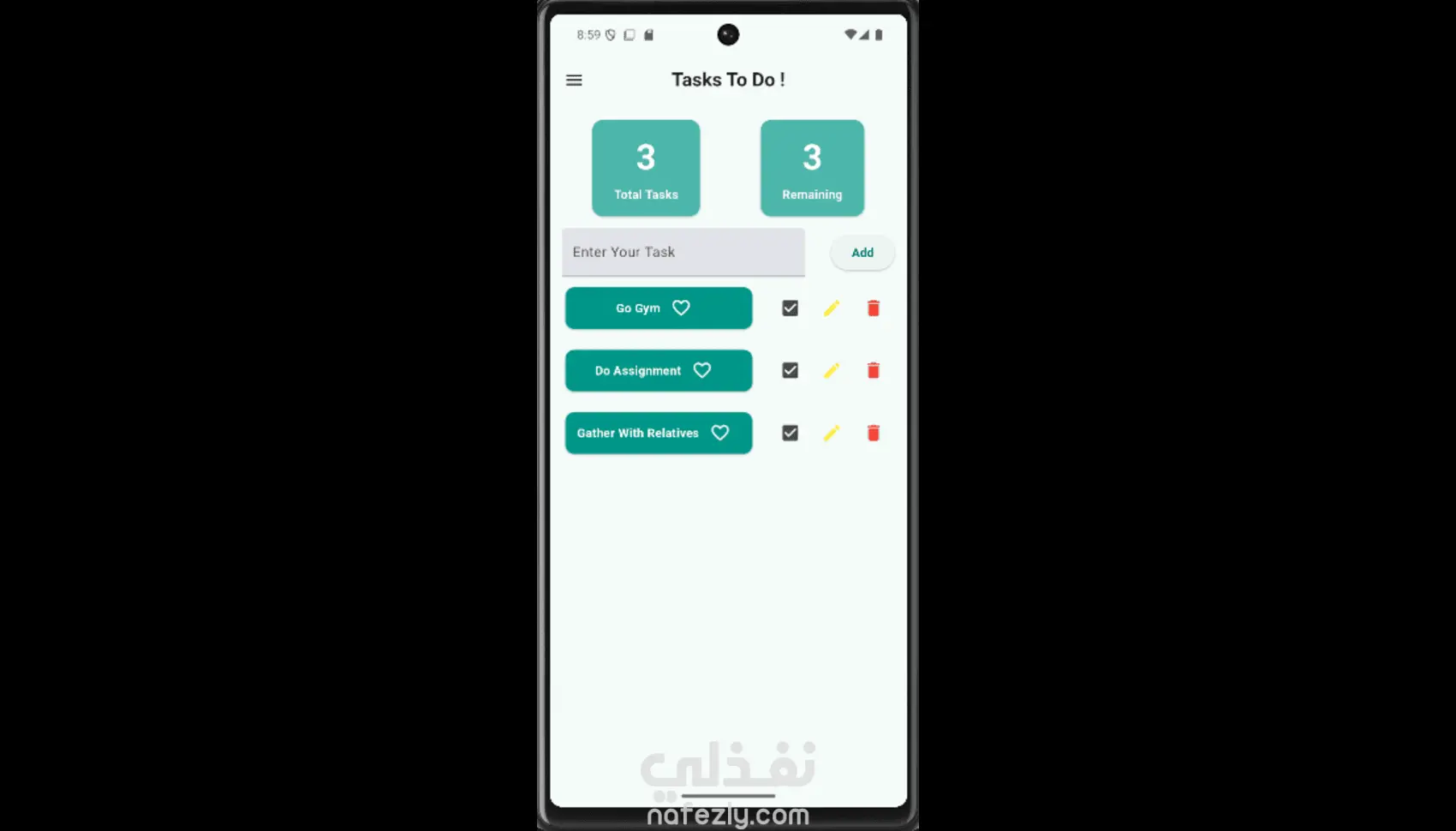 تطبيق قائمة مهام بسيط وتفاعلي تم تطويره باستخدام Flutter كجزء من فترة تدريبي في DEPI. يساعد التطبيق المستخدمين على تنظيم مهامهم اليومية بكفاءة من خلال ميزات مثل الإضافة، التعديل، الحذف، تحديد المهام كمكتملة، وإدارة المهام المفضلة. الميزات شاشة تسجيل الدخول مع التحقق من صحة البيانات. إدارة المهام: إضافة، تعديل، حذف، وتحديد/إلغاء تحديد المهام كمكتملة. عدادات توضح إجمالي المهام وعدد المهام المتبقية. صفحة المفضلات لعرض وإدارة المهام المهمة. إدارة الحالة (State Management) باستخدام Provider لهيكلية نظيفة وقابلة للتوسع. دعم متعدد المنصات (Android، iOS، Web). الأدوات والتقنيات المستخدمة Flutter SDK لغة Dart Android Studio (بيئة التطوير) Provider لإدارة الحالة
