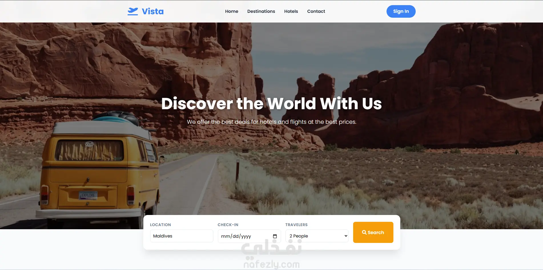 هو واجهةلموقع لحجز السفر والسياحة. يركز التصميم على إبراز وجهات السفر الجذابة ويحتوي على شريط بحث متطور ونظام عرض بطاقات (Cards) للمنتجات أو العروض السياحية.