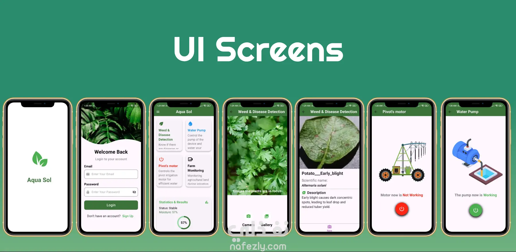 أكوا سول هو نظام ري ذكي مبتكر مصمم لتعزيز كفاءة وذكاء الزراعة المحورية. يتضمن الحل محاكاةً للأجهزة وتطبيقًا جوالًا للتحكم والمراقبة عن بُعد بشكل كامل. نظام متكامل يجمع بين الأجهزة والذكاء الاصطناعي والأتمتة والطاقة الشمسية وتكنولوجيا الهاتف المحمول. يوفر للمزارعين رؤى آنية وتحكمًا دقيقًا في عملية الري، مما يجعل الزراعة أكثر استدامة وإنتاجية. تشمل الميزات الرئيسية للنظام ما يلي: التحكم الآلي في الري يستخدم النظام بيانات رطوبة التربة اللحظية لتشغيل الري أو إيقافه تلقائيًا، مما يُحسّن استخدام المياه ويُقلل من التدخل البشري. المراقبة عن بُعد عبر تطبيق الهاتف المحمول يمكن للمزارعين مراقبة المضخة ومحرك الدوران والتحكم بهما، وعرض بيانات المستشعر مباشرةً من هواتفهم. دمج الكاميرات لمراقبة المحاصيل تساعد الكاميرا اللحظية في الكشف عن مشاكل صحة النبات باستخدام الذكاء الاصطناعي. ️ أجهزة تعمل بالطاقة الشمسية واجهة مستخدم تشمل اللغة العربية و الانجليزية تجعل الطاقة المستدامة Aqua Sol مثاليًا للبيئات الريفية/غير المتصلة بالشبكة.