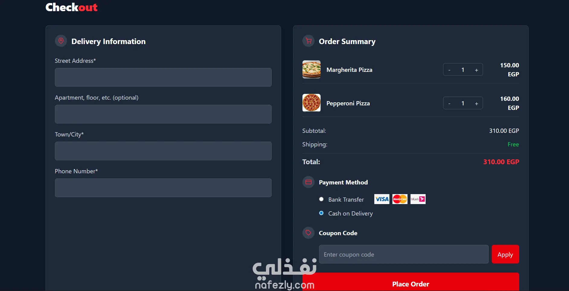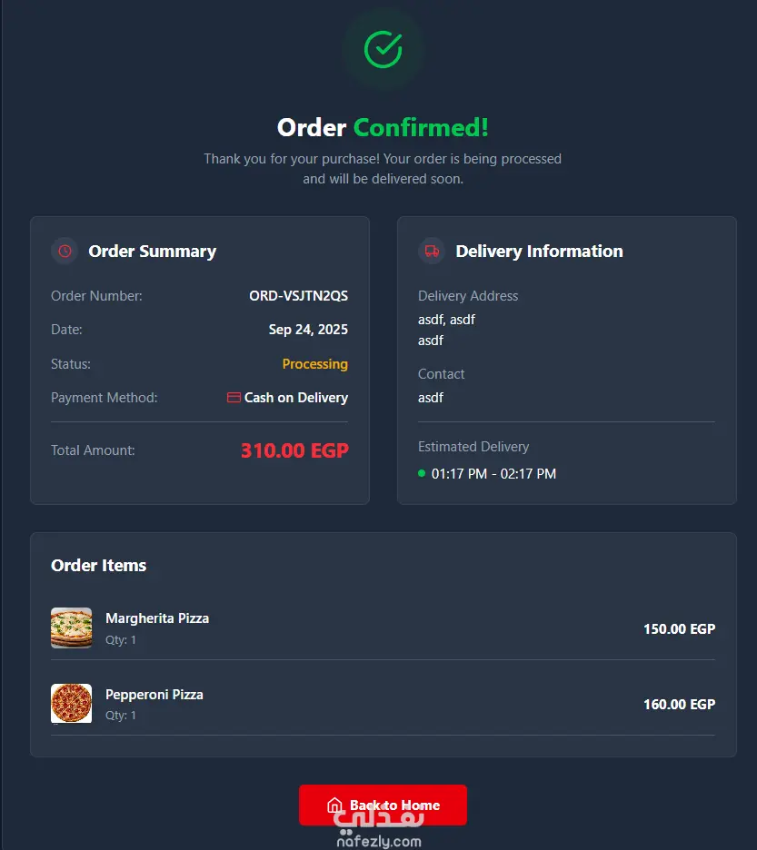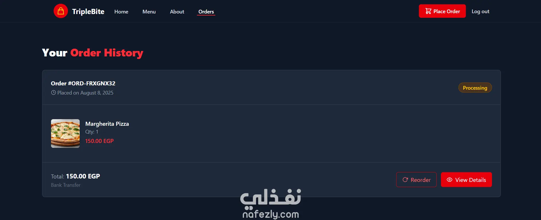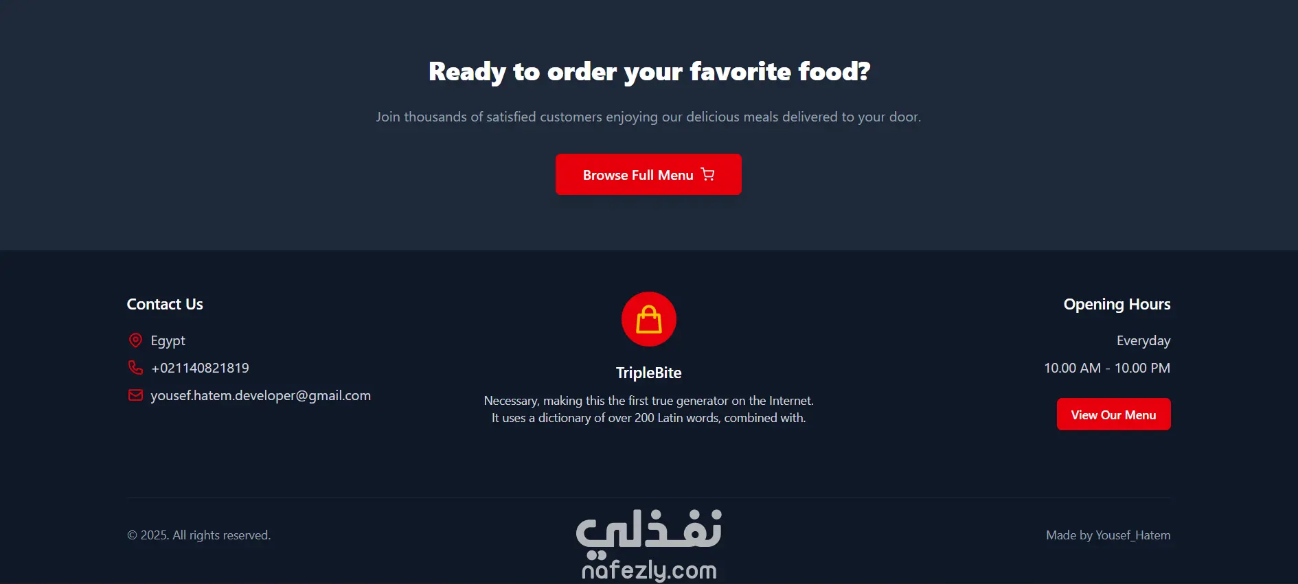هذا المشروع هو المهمة الرابعة من المرحلة الثانية في تدريبي داخل DevWave. قمت بتطوير واجهة موقع طلب طعام حديث ومتجاوب بالكامل باسم TripleBite باستخدام React.js وTailwind CSS، بينما تم بناء الجزء الخلفي باستخدام Django بواسطة أحد أعضاء الفريق. يقدم المشروع تجربة طلب طعام سلسة، سريعة، ومناسبة لجميع الأجهزة. رابط المعاينة المباشرة: phase-2-task-4-dev-wave.vercel.app التقنيات المستخدمة تشمل React.js وTailwind CSS في الواجهة الأمامية، مع Backend مبني بـ Django، بالإضافة إلى تصميم متجاوب بالكامل يعمل بمنهجية Mobile First لضمان تجربة مثالية على الهاتف والتابلت والكمبيوتر. المشروع يحتوي على واجهة طلب طعام كاملة بتصميم نظيف وحديث، مع واجهة تفاعلية مبنية بـ React.js، وتصميم باستخدام Tailwind CSS، بالإضافة إلى دمج متكامل مع نظام Django لإدارة الطلبات، القوائم، والمستخدمين. كما يوفر خصائص مهمة مثل تصفية القائمة حسب الفئات، نظام عربة تسوق ديناميكي، تجربة طلب سهلة من الهاتف، وصفحة دفع واستكمال الطلب. هدف المهمة كان بناء نظام طلب طعام متكامل بين الواجهة الأمامية والباك إند، مع ضمان تجربة استخدام سلسة على جميع الأجهزة، وهيكلية واضحة تعتمد على مكوّنات React، مع تصميم موحد وحديث باستخدام Tailwind CSS. يتكون المشروع من صفحة قائمة تعرض الأصناف حسب الفئات مع إمكانية إضافتها إلى العربة، وصفحة عربة وتسوق لمراجعة وتعديل الطلبات وإتمام الدفع، بالإضافة إلى تصميم متجاوب بالكامل مناسب لمختلف الشاشات. الجانب الخلفي (API) مسؤول عن إدارة الطلبات، تسجيل الدخول، وبيانات القائمة والمستخدمين.