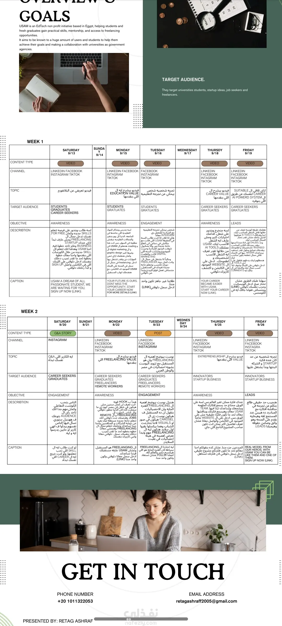 صناعة خطة محتوي لمواعيد تنزيل المنشورات ، الخطة تحتوي علي كل التفاصيل (المواعيد بالساعات والأيام ـ المحتوي وكتابته ـ الهدف من المنشور ـ الجمهور المستهدف ـ المواقع التي سيتم انزال المشروع عليها)