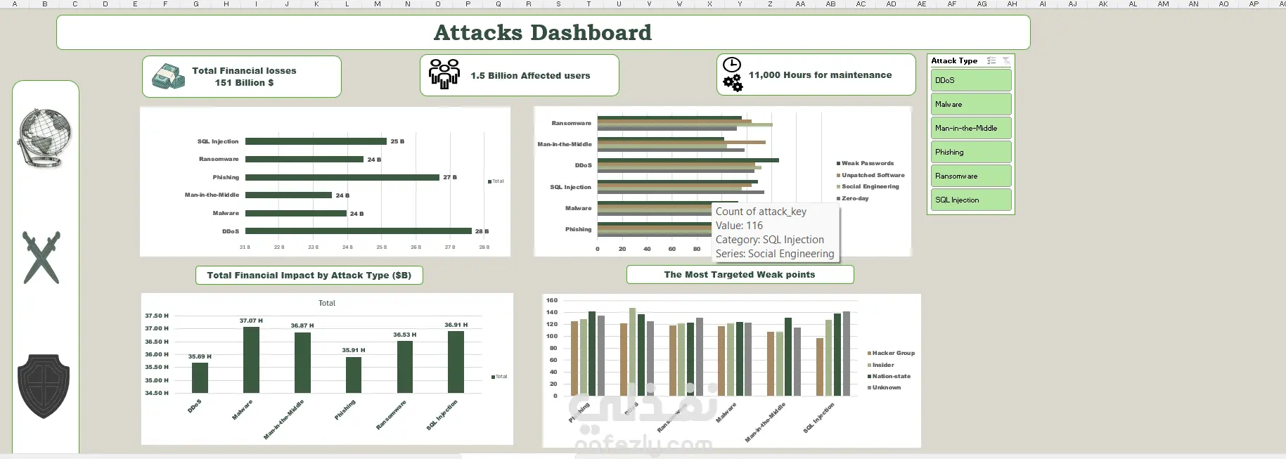 قمت بتنفيذ داشبورد باستخدام الاكسيل فى تحليل بيانات تتعلق عن الهجمات الالكترونية التى تتعرض لها البلاد على مدار تسع سنوات