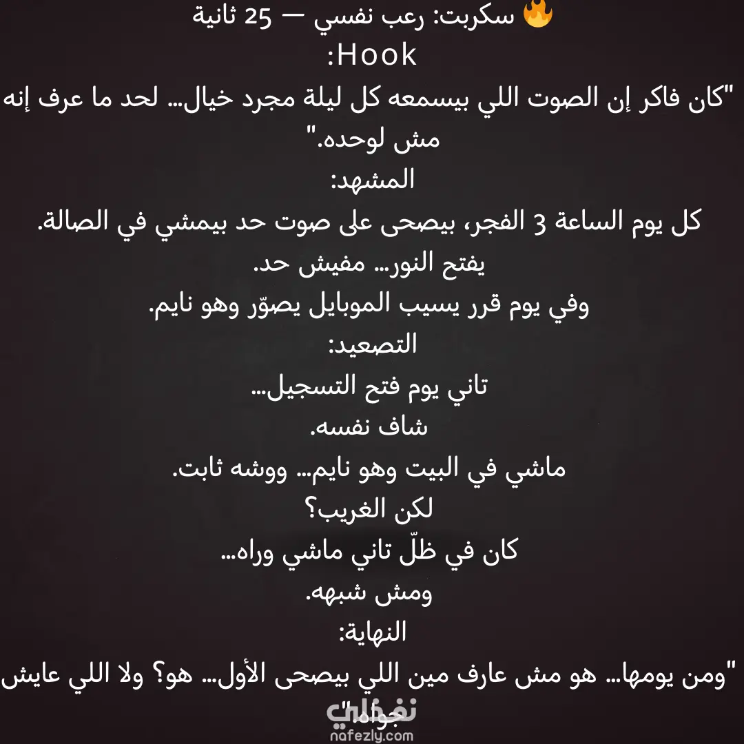 هذا نموذج لسكربت رعب نفسي قمت بكتابته لاستعراض أسلوبي في كتابة المحتوى القصير. السكريبت يعتمد على بناء توتر سريع، وخطاف قوي (Hook) من أول ثانية، ثم تصعيد الأحداث بشكل مناسب لفيديوهات TikTok و Reels و YouTube Shorts. هذا العمل يوضح قدرتي على صياغة جمل جذابة، وترتيب المشاهد بشكل يشد المشاهد حتى النهاية.