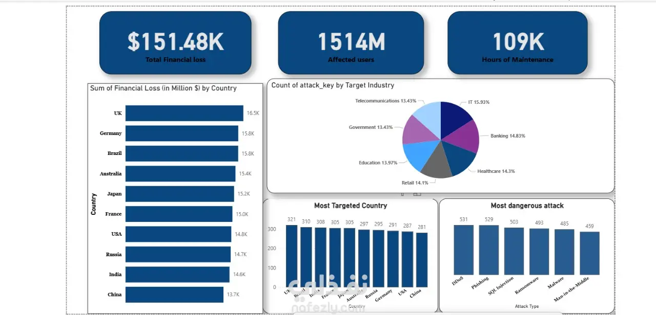 قمت بعمل داشبورد بها اهم تحليل للبيانات للهجمات الالكترونية باستخدام باور بى اى