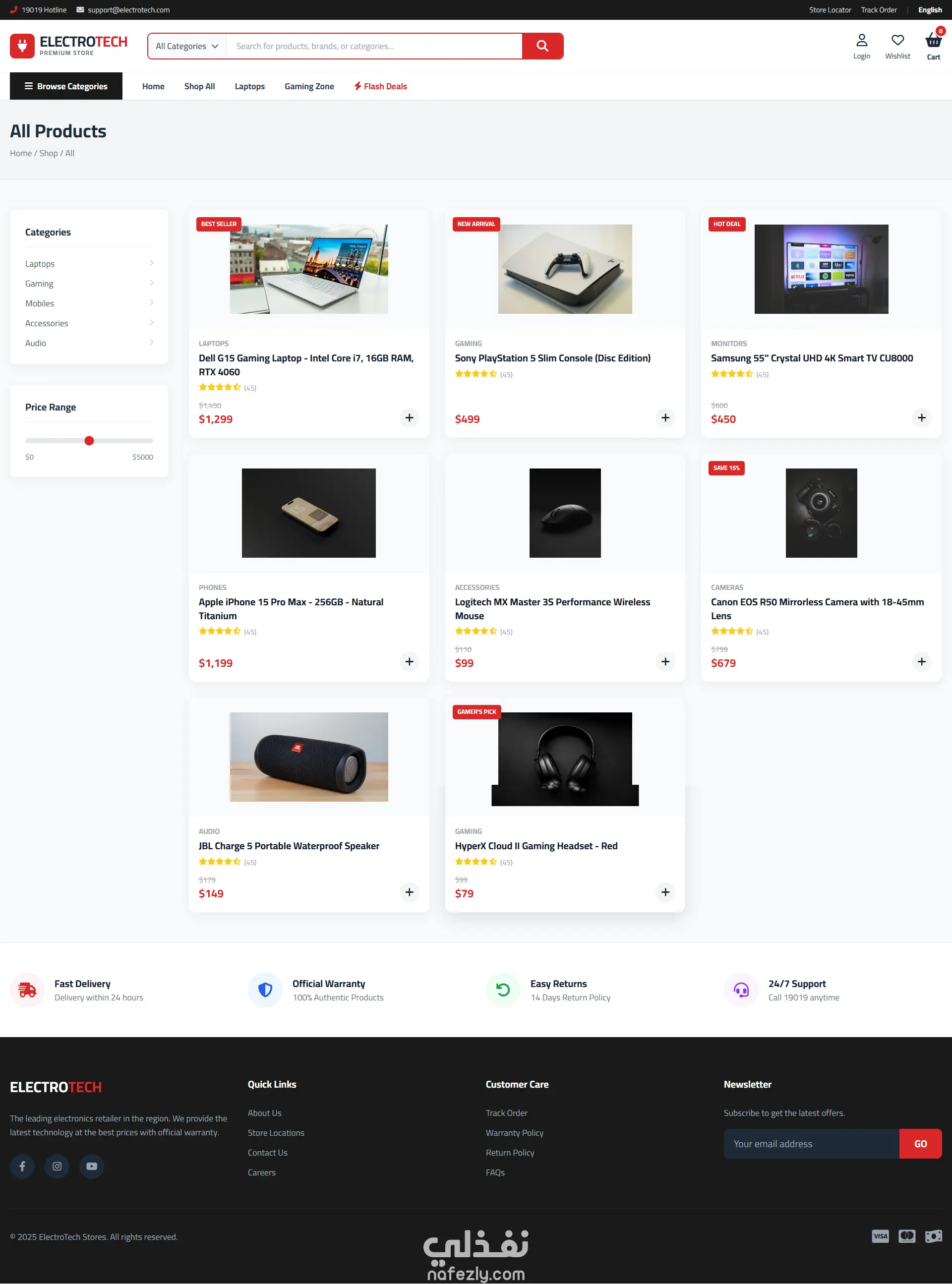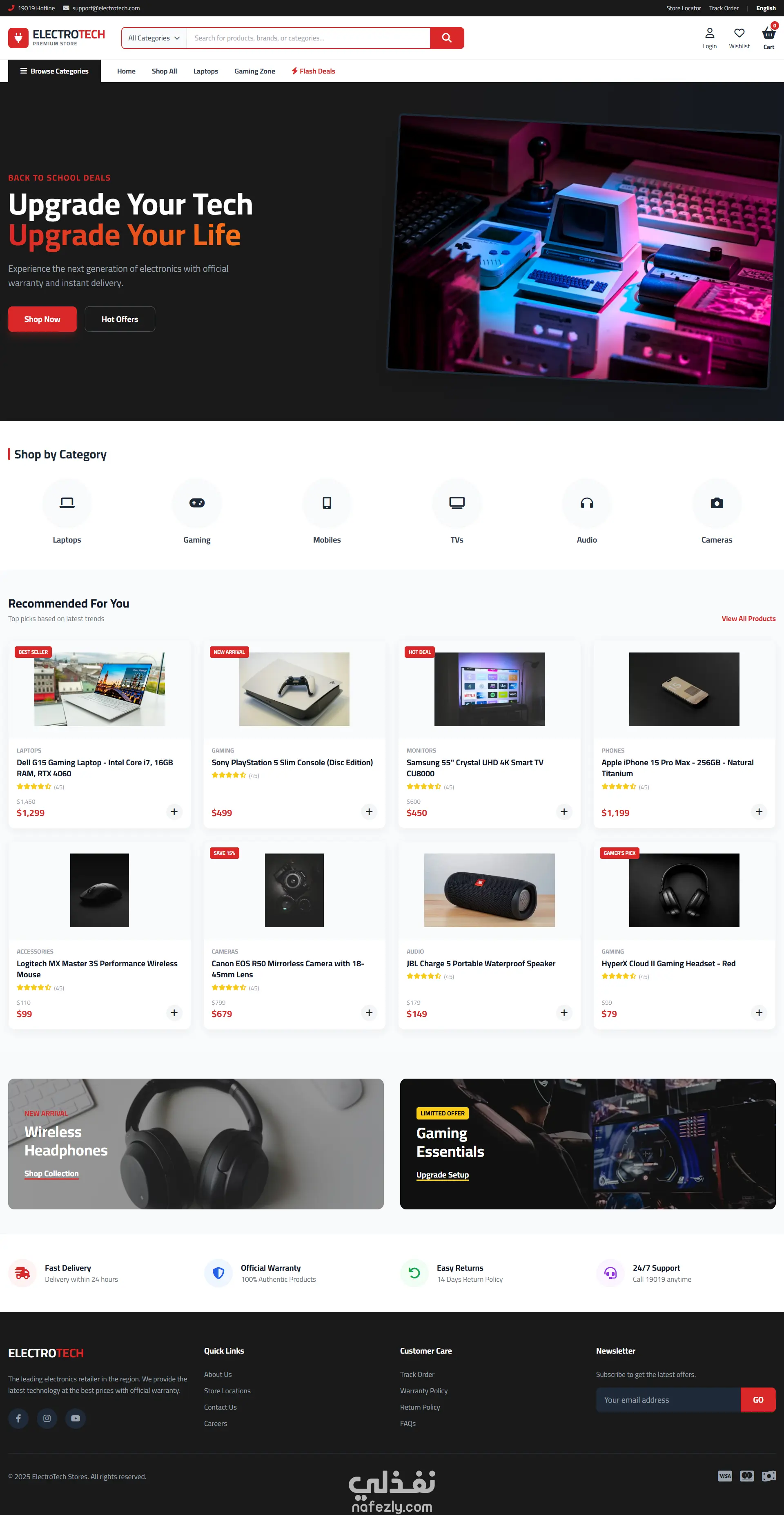 تطبيق ويب لصفحة واحدة (SPA) يحاكي تجربة المتاجر الإلكترونية الكبرى في المنطقة (مثل B.TECH)، مع التركيز على التصميم الاحترافي وسرعة الأداء. التقنيات المستخدمة: الواجهة: HTML5, Tailwind CSS. البرمجة: Vanilla JavaScript (بدون أطر عمل). إدارة البيانات: LocalStorage (لحفظ عربة التسوق). أهم المميزات: تصفح ديناميكي: تنقل سلس بين الصفحات (الرئيسية، المتجر، المنتج) دون إعادة تحميل الصفحة. إدارة عربة التسوق: إضافة منتجات، تعديل الكميات، وحفظ محتوى العربة تلقائياً عند الخروج. تصميم متجاوب: واجهة مستخدم عصرية تعمل بكفاءة على الهواتف وأجهزة الكمبيوتر. عناصر الثقة: تصميم يبرز عروض الشحن، الضمان، وخدمة العملاء لتعزيز تجربة المستخدم.