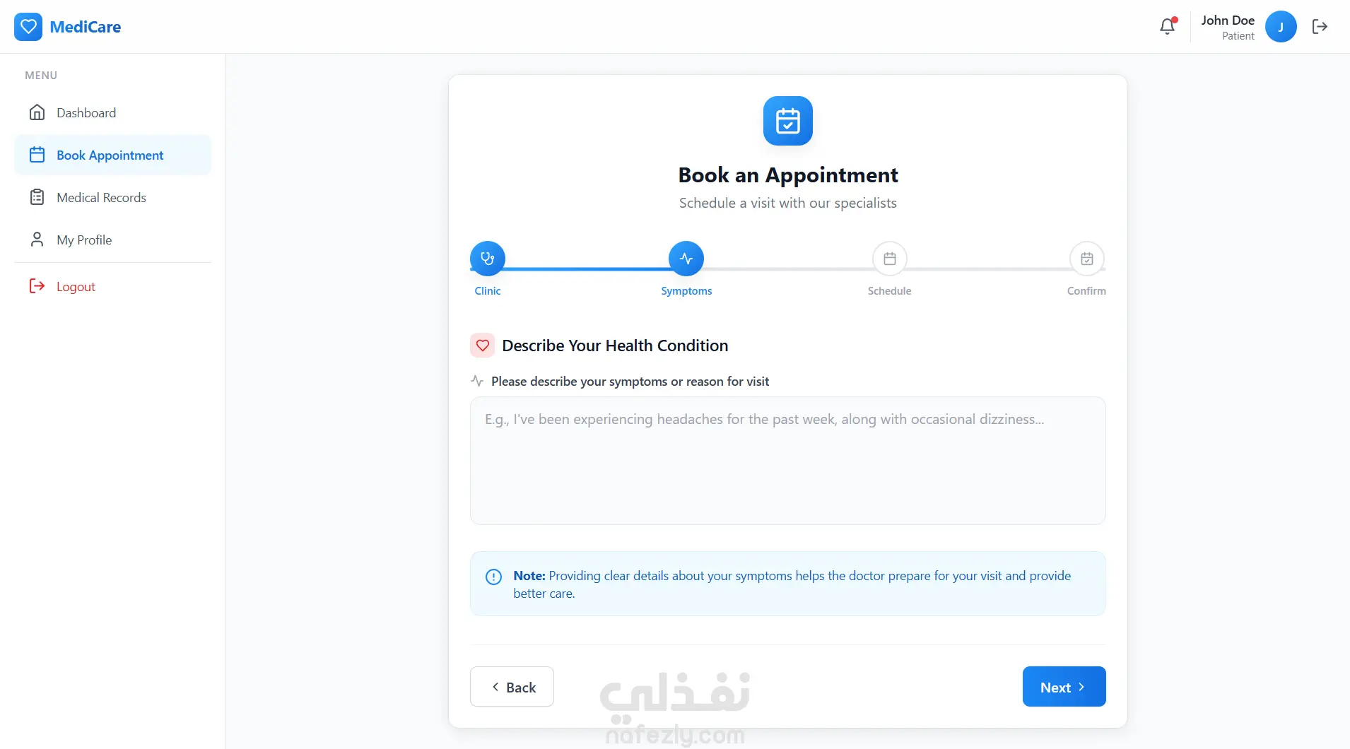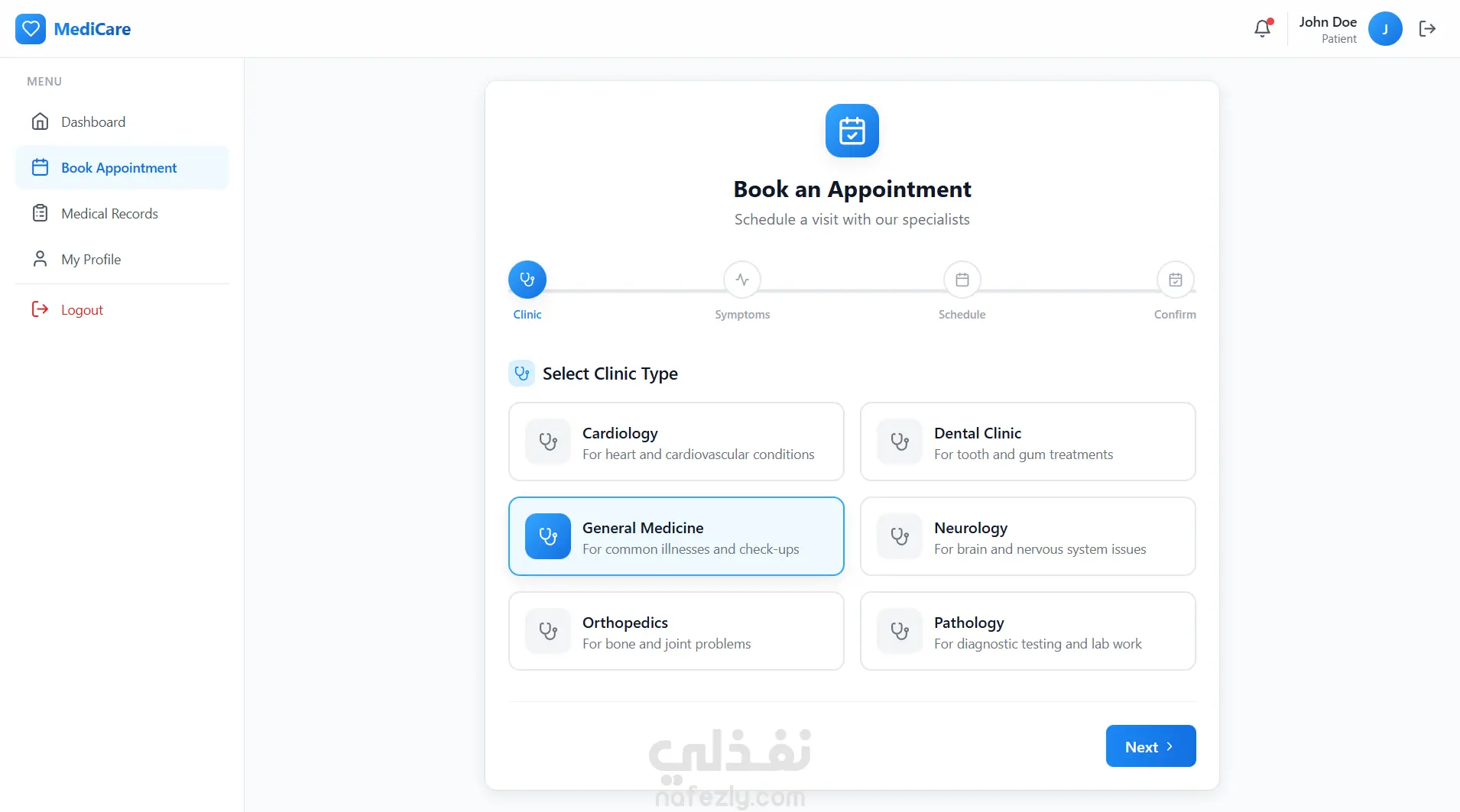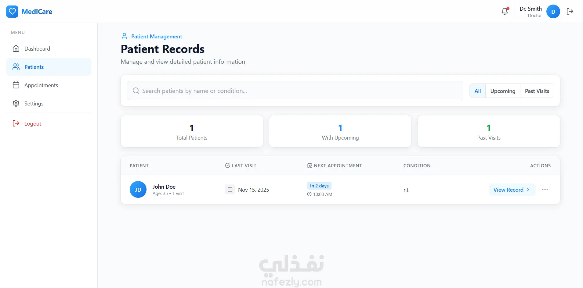 تطوير نظام إدارة العيادات الطبية باستخدام NodeJS , React لحجز المواعيد وإدارة المرضى.