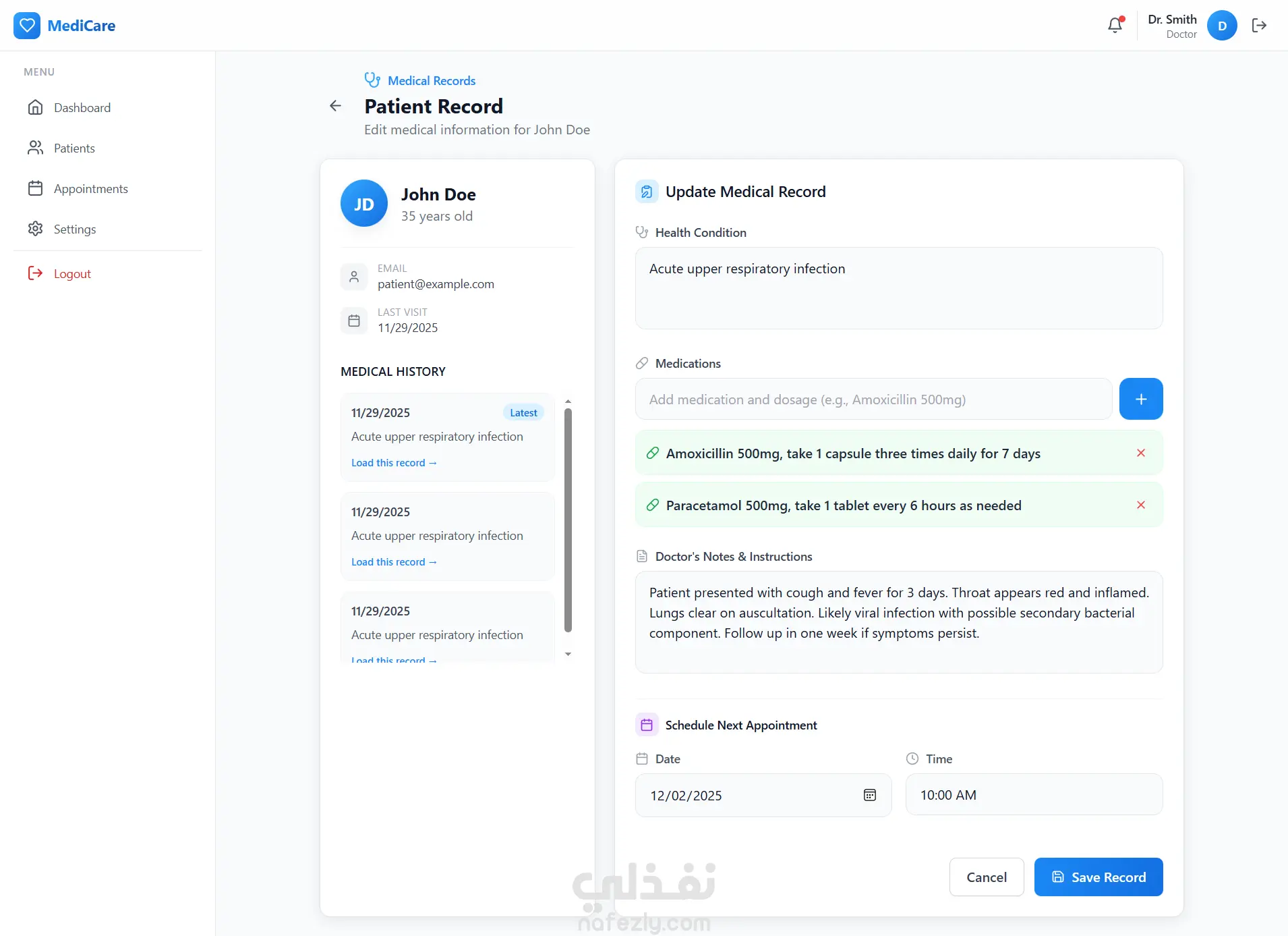 Clinic System لإدارة العيادات. بيحل مشاكل كتير بنشوفها في العيادات من كروت ورق، مواعيد بتتلخبط، وروشتات بتضيع. فقررت أعمل سيستم عملي وسهل يخلي الشغل ماشي بمنتهى السلاسة. أهم المميزات: -تسجيل بيانات المرضى بشكل منظم وواضح. -حجز وتنظيم المواعيد للدكاترة، بحيث كل دكتور يقدر يشوف يومه ومواعيده. -ملفات طبية كاملة لكل مريض تشمل الزيارات، الشكاوي، التشخيص، وكل حاجة تخص حالته. -الروشتة الإلكترونية الدكتور بيكتب العلاج من جوه السيستم، والمريض يقدر يشوف الروشتة في أي وقت من حسابه من غير ما يعتمد على الورق. -متابعة العلاج المريض يقدر يشوف الأدوية، الجرعات، وأي ملاحظات كتبها له الدكتور. -تحديد الزيارة الجاية بعد ما الدكتور يخلص الكشف، بيحدد للمريض موعد الزيارة اللي بعدها، والمريض بيقدر يشوفها من حسابه ويعرف هو راجع امتى من غير ما يسأل أو يدوّر. -نظام صلاحيات يضمن إن كل واحد يدخل الجزء الخاص بشغله بس (دكتور – موظف – مسؤول). -إدارة الأطباء والموظفين ومتابعة شغل العيادة بشكل كامل. -واجهة بسيطة وسهلة علشان المستخدم يوصل لأي حاجة بسرعة من غير تعقيد.