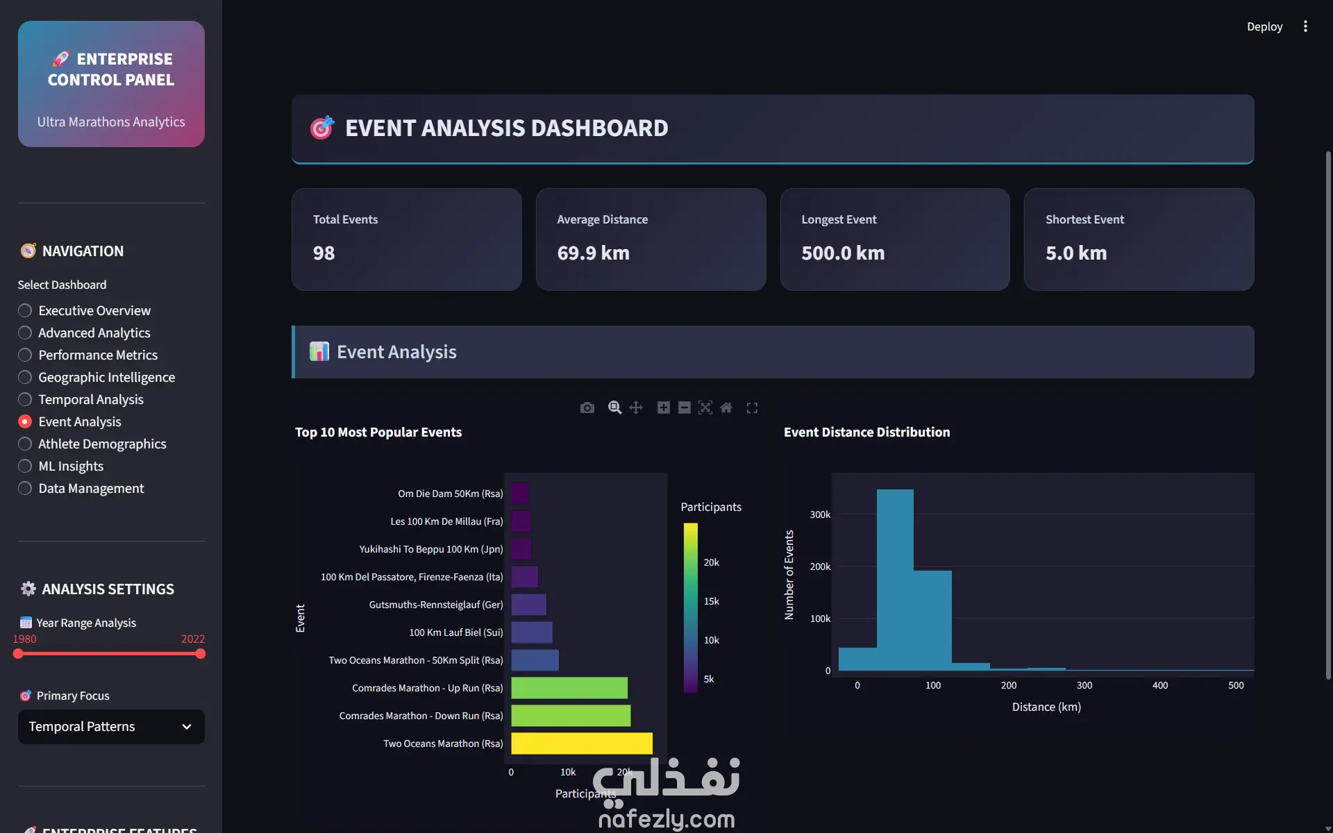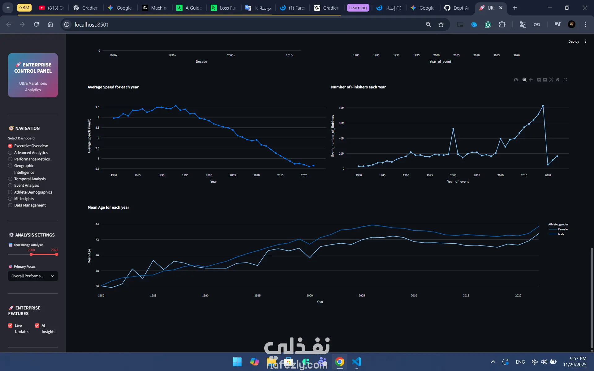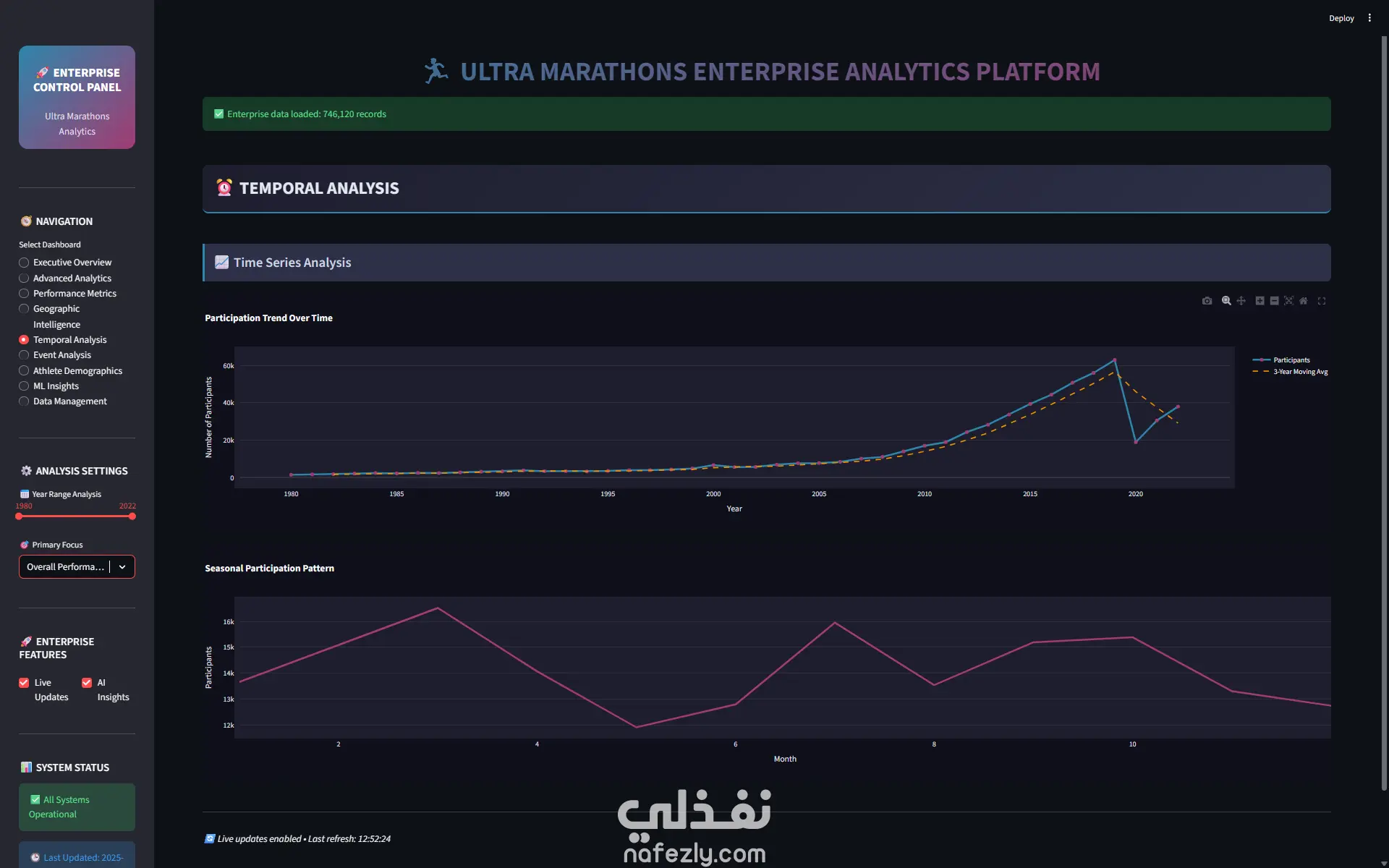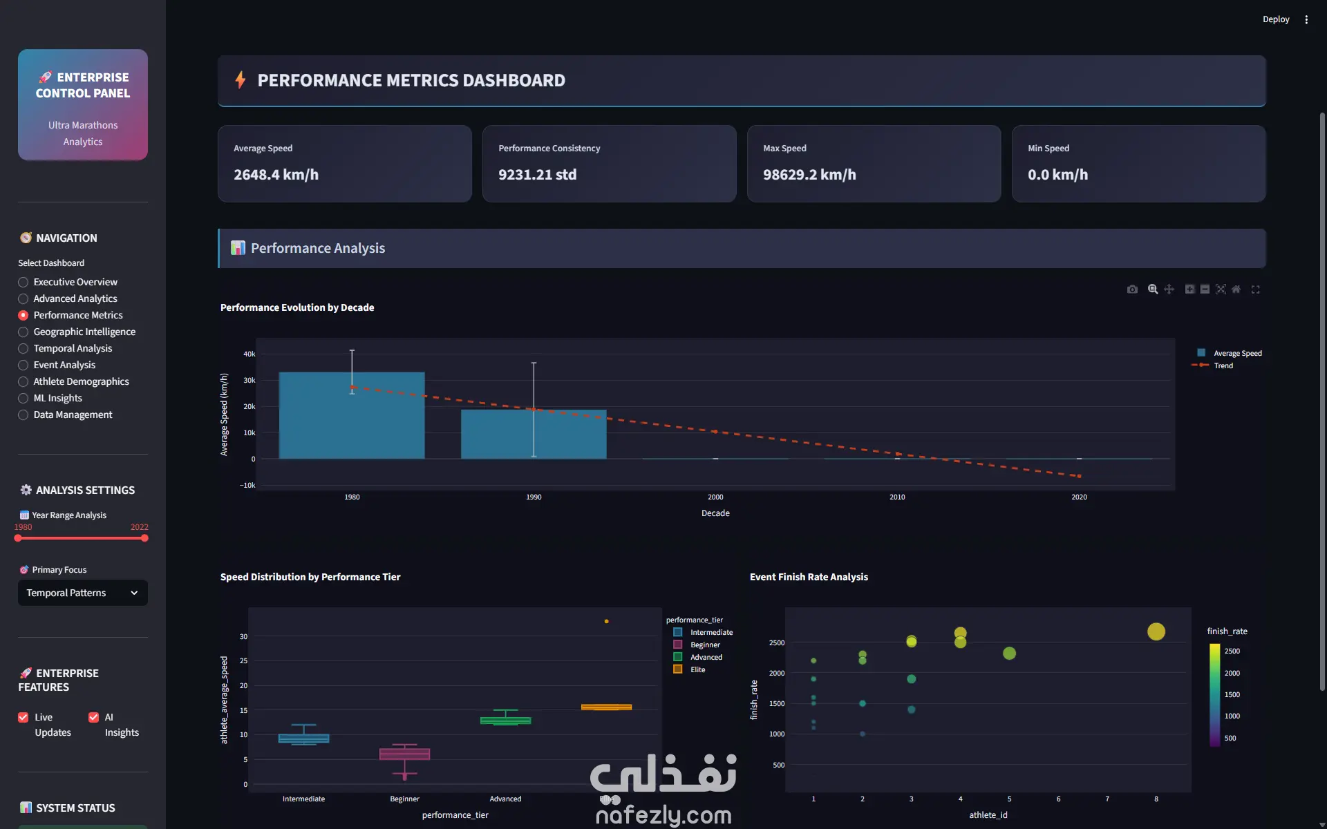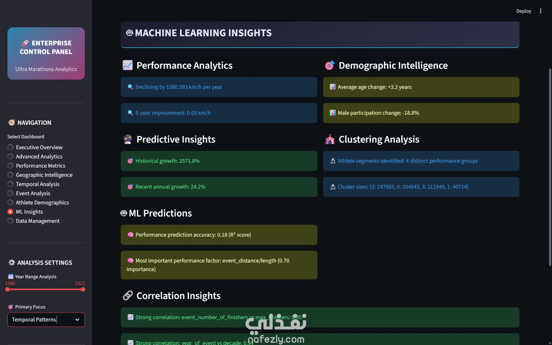مشروع التحليل الاستكشافي لبيانات سباقات الماراثون (1980-2022) نظرة عامة على المشروع هذا المشروع يمثل رحلة تحليلية معمقة للبيانات التاريخية لسباقات الماراثون العالمية التي تمتد لأكثر من أربعة عقود، من عام 1980 حتى عام 2022. الهدف الأساسي هو الكشف عن الاتجاهات والتغيرات الهيكلية في ثقافة الجري وأداء العدّائين على مر العقود، وكيف تطورت هذه الرياضة عالمياً. الأدوات المستخدمة التحليل والمعالجة: Python (Pandas, NumPy). تصميم لوحة التحكم (الداشبورد): Streamlit. مقاييس الأداء الرئيسية التي تم استكشافها تم تطوير لوحة تحكم تفاعلية (Dashboard) باستخدام Streamlit لعرض مجموعة من المقاييس المحورية التي توضح تطور سباقات الماراثون: نمو المشاركة حسب الجنس (Gender Growth): تحليل تطور أعداد المشاركين من الذكور والإناث في كل عقد من الزمن. تتبع نسبة مشاركة الإناث وإبراز مدى التنوع والشمولية المتزايدة في السباقات. متوسط السرعة لكل عقد (Average Speed Evolution): حساب متوسط سرعة الجري لجميع العدّائين في كل عقد (الثمانينات، التسعينات، 2000... إلخ). مقارنة الأداء على المستوى الكلي لتحديد ما إذا كان الأداء العام للمتسابقين يتحسن أو يتراجع زمنياً. تحليل أعداد المتسابقين وتصنيفهم (Racers by Decade): إحصاء إجمالي عدد المتسابقين الذين أكملوا السباق في كل عقد. تقسيم المتسابقين حسب الفئات العمرية (Age Groups) والجنس لتحديد الفئات الأكثر نشاطاً ومشاركة على مر الزمن. الاستنتاجات والمكتشفات الرئيسية من خلال هذا التحليل الاستكشافي، تم التوصل إلى عدة استنتاجات مهمة أبرزها: تزايد التنوع: هناك ارتفاع ملحوظ ومستمر في نسبة مشاركة الإناث، خصوصاً في العقدين الأخيرين، مما يعكس تحولاً ثقافياً كبيراً في رياضة الماراثون. تحسّن الأداء: أظهرت البيانات أن متوسط سرعة إكمال الماراثون قد تحسن بشكل طفيف أو استقر عند مستويات عالية، مما يدل على احترافية أكبر للمشاركين وتطور برامج التدريب. دخول فئات جديدة: تحليل الفئات العمرية أشار إلى زيادة في مشاركة المتسابقين من الفئات الأكبر سناً (الـ Masters)، مما يبرز شعبية الماراثون كرياضة مدى الحياة. هذا المشروع يوفر منصة واضحة ومبسطة لفهم تاريخ وأداء سباقات الماراثون العالمية، ويسلط الضوء على القصص الكامنة وراء الأرقام.
