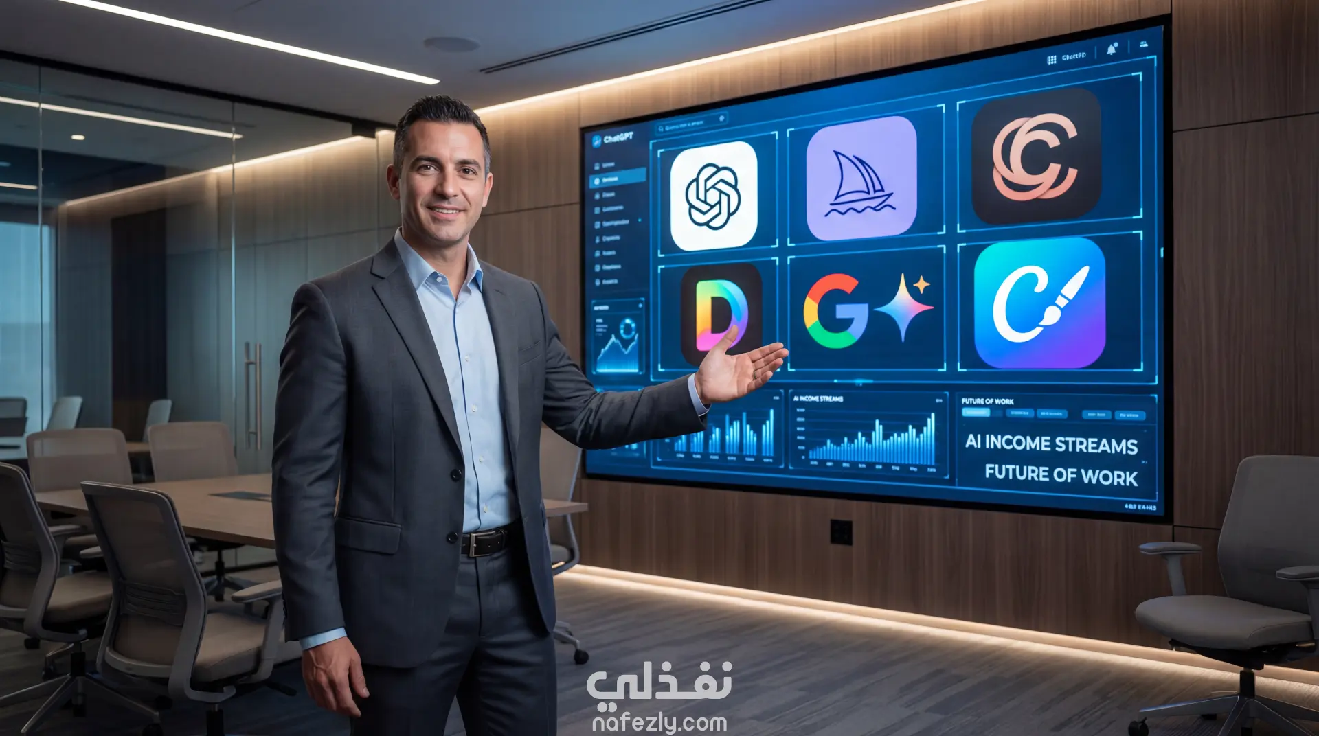 صورة احترافية بالذكاء الاصطناعي تُظهر رجلًا يشرح طرق الربح من الذكاء الاصطناعي أمام شاشة رقمية كبيرة مليئة بعناصر تقنية حديثة، مثل لوجوهات أدوات الذكاء الاصطناعي وبيانات تفاعلية ورموز رقمية. تعكس الصورة فكرة تعليم مهارات الذكاء الاصطناعي وتحويلها إلى مصادر دخل، مع تأثيرات بصرية توحي بالنجاح والربح عبر الإنترنت. تم تصميم الصورة بجودة عالية وتفاصيل دقيقة، لتناسب المحتوى التعليمي والخدمات الرقمية وصفحات الهبوط الخاصة بدورات تعليم الربح من AI