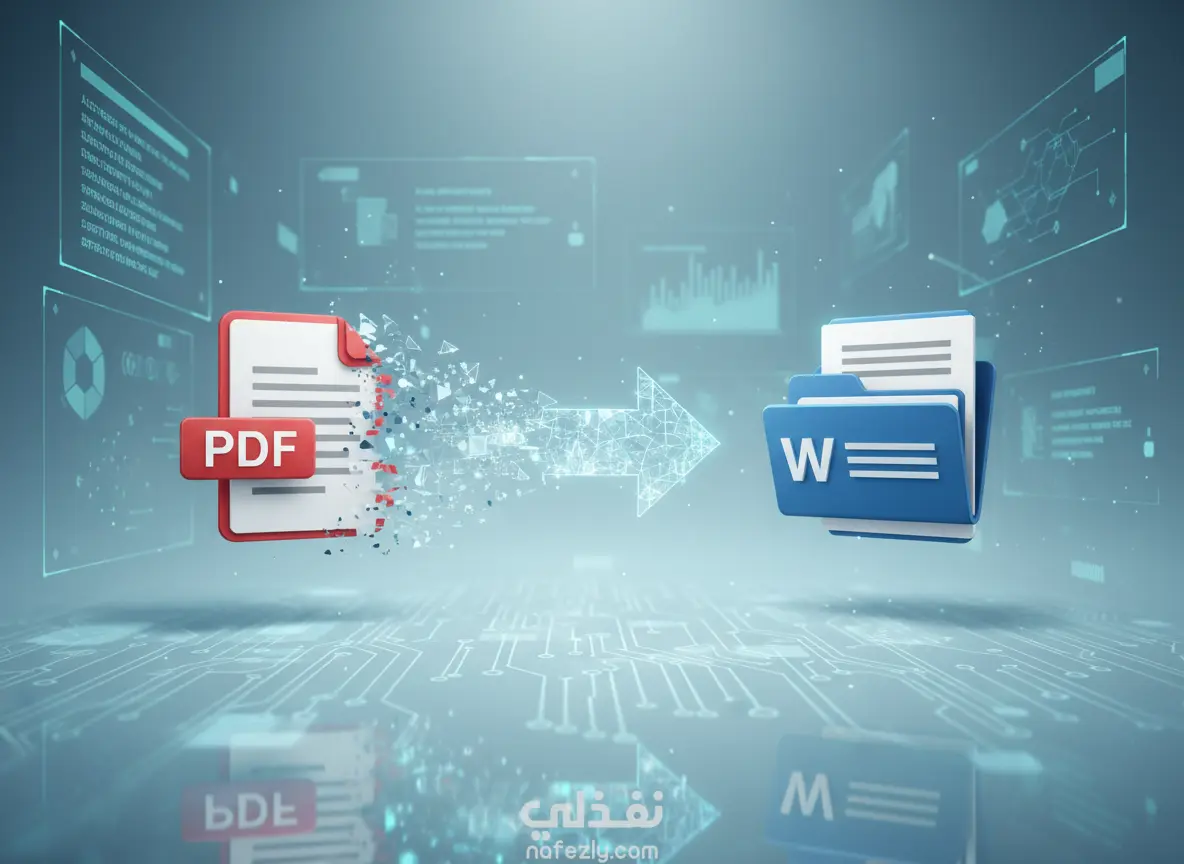 تصميم صورة احترافية بالذكاء الاصطناعي تمثل خدمة تحويل ملفات PDF إلى ملفات Word بسهولة وسرعة. تحتوي الصورة على عناصر رقمية توضح عملية التحويل، مثل أيقونات PDF وWord، أسهم توضيحية، وشاشة جهاز كمبيوتر حديث، لتعكس بساطة وسلاسة العملية. الصورة مناسبة للاستخدام في مواقع الخدمات الرقمية، التسويق الإلكتروني، ومحتوى تعليمي، وتساعد على جذب العملاء بطريقة واضحة وجذابة. تصميم عالي الجودة، ألوان واضحة، ودقة ممتازة تناسب المحتوى الرقمي والتسويق عبر الإنترنت.