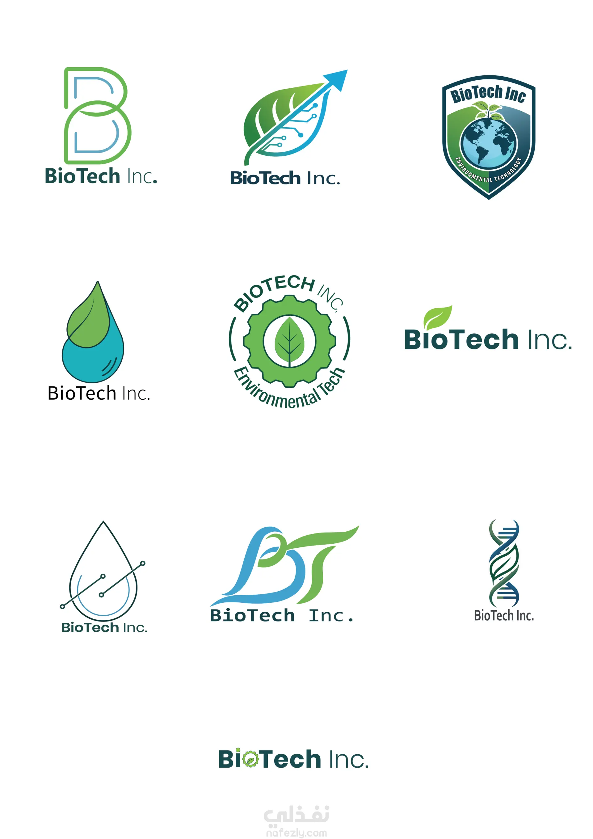 تصميم مجموعة شعارات لشركة ناشئة بأنماطًا وأنواعً مختلفة من التصميم. هناك شعارات حرفية نظيفة تعتمد على حرف B مع كتابة حديثة لاسم الشركة، وعلامات تجمع بين التقنية والطبيعة باستخدام أوراق وقطرات ماء وخطوط دوائر إلكترونية، إضافة إلى شعارات شِعارية (Emblems) بدرع أو دائرة تمنح إحساسًا مؤسسيًا رسميًا. بعض التصاميم عبارة عن كلمة بسيطة مع أيقونة بيئية صغيرة، بينما يستخدم البعض الآخر خطوطًا تجريدية لقطرة ماء، أو حروفًا متداخلة ديناميكية، أو شكل DNA مكوَّن من أوراق. بشكل عام، المجموعة تتحرك من أسلوب بسيط وشركي إلى أسلوب أكثر توضيحًا وعلمية، مع الحفاظ على ثيم بيئي-تقني بألوان الأخضر والأزرق.