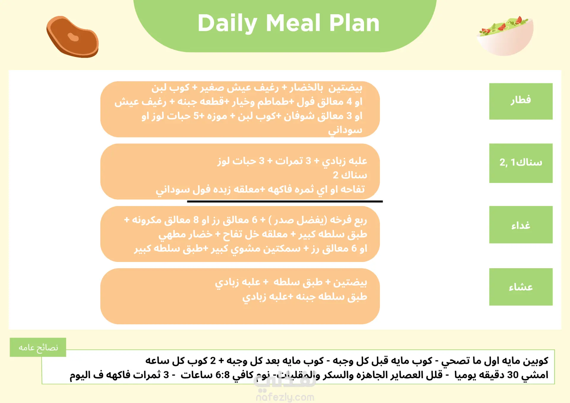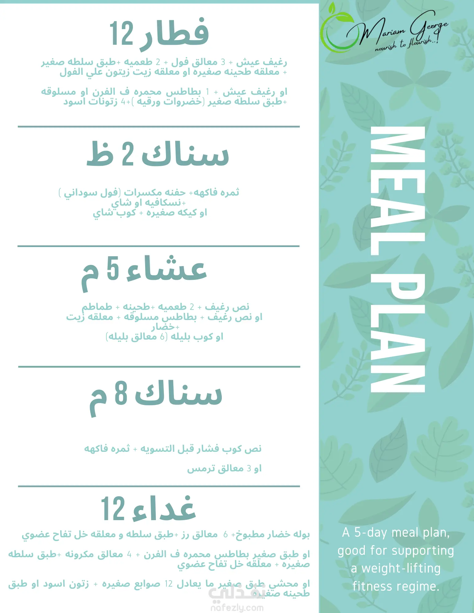 برنامج أسبوعي كامل: فطار – غداء – عشاء – سناكس.