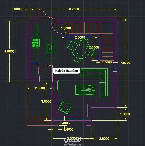رسم المخطط بخطوط أوتوكاد باستخدام أوامر مثل Line وOffset وTrim.