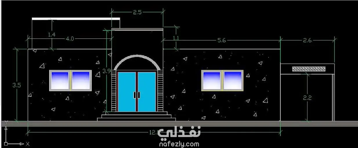 العمل عبارة عن رسم Elevation لواجهة مبنى سكني/منشأة صغيرة باستخدام برنامج AutoCAD. يظهر المخطط تفاصيل الواجهة الخارجية بشكل دقيق من حيث الأبعاد، النوافذ، المدخل الرئيسي، العناصر الجمالية، والارتفاعات.