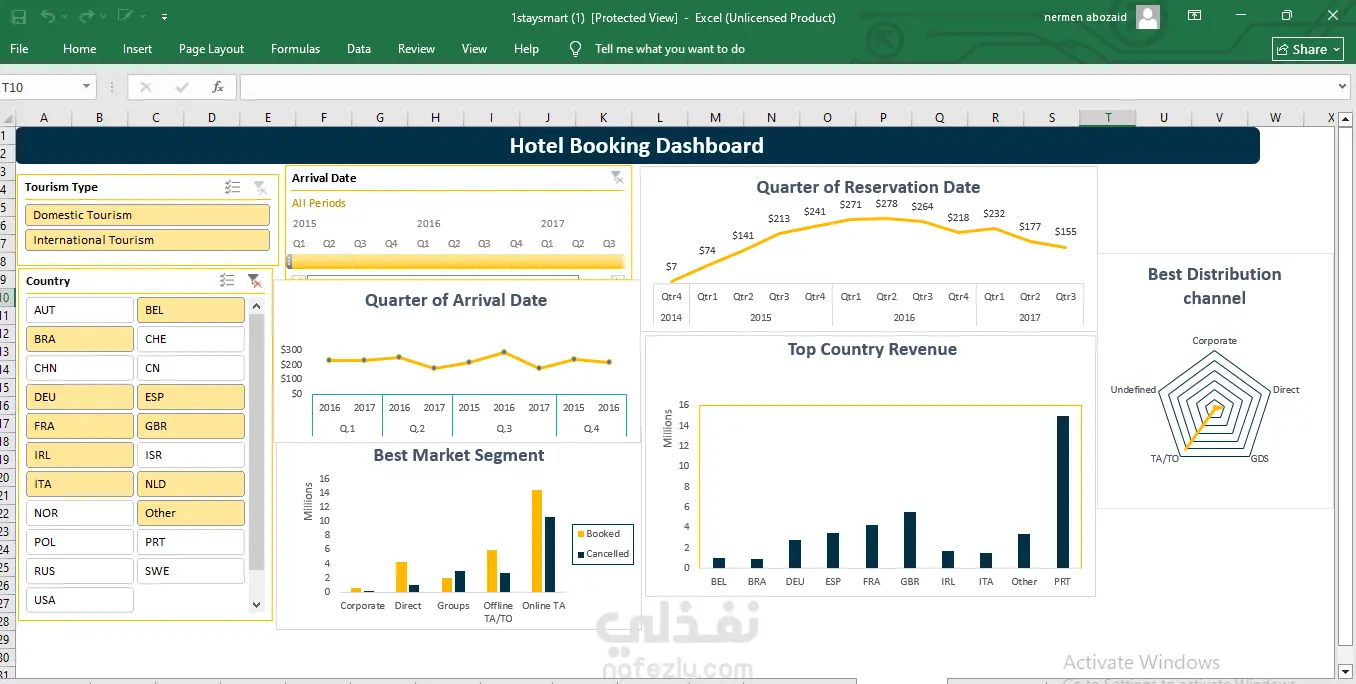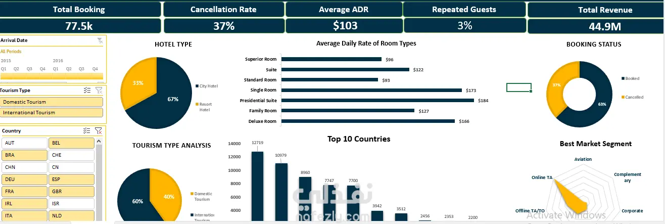 قمت بتحليل بيانات حجوزات الفنادق من خلال تنظيف البيانات ومعالجة القيم المفقودة والمكررة، وتصحيح أنواع البيانات. بعد ذلك تم استخراج أهم مؤشرات الأداء مثل نسب الإشغال، الإلغاء، ومتوسط مدة الإقامة. كما قمت بتصميم داش بورد تفاعلية توضح النتائج بشكل واضح وتساعد في اتخاذ القرارات بناءً على البيانات.