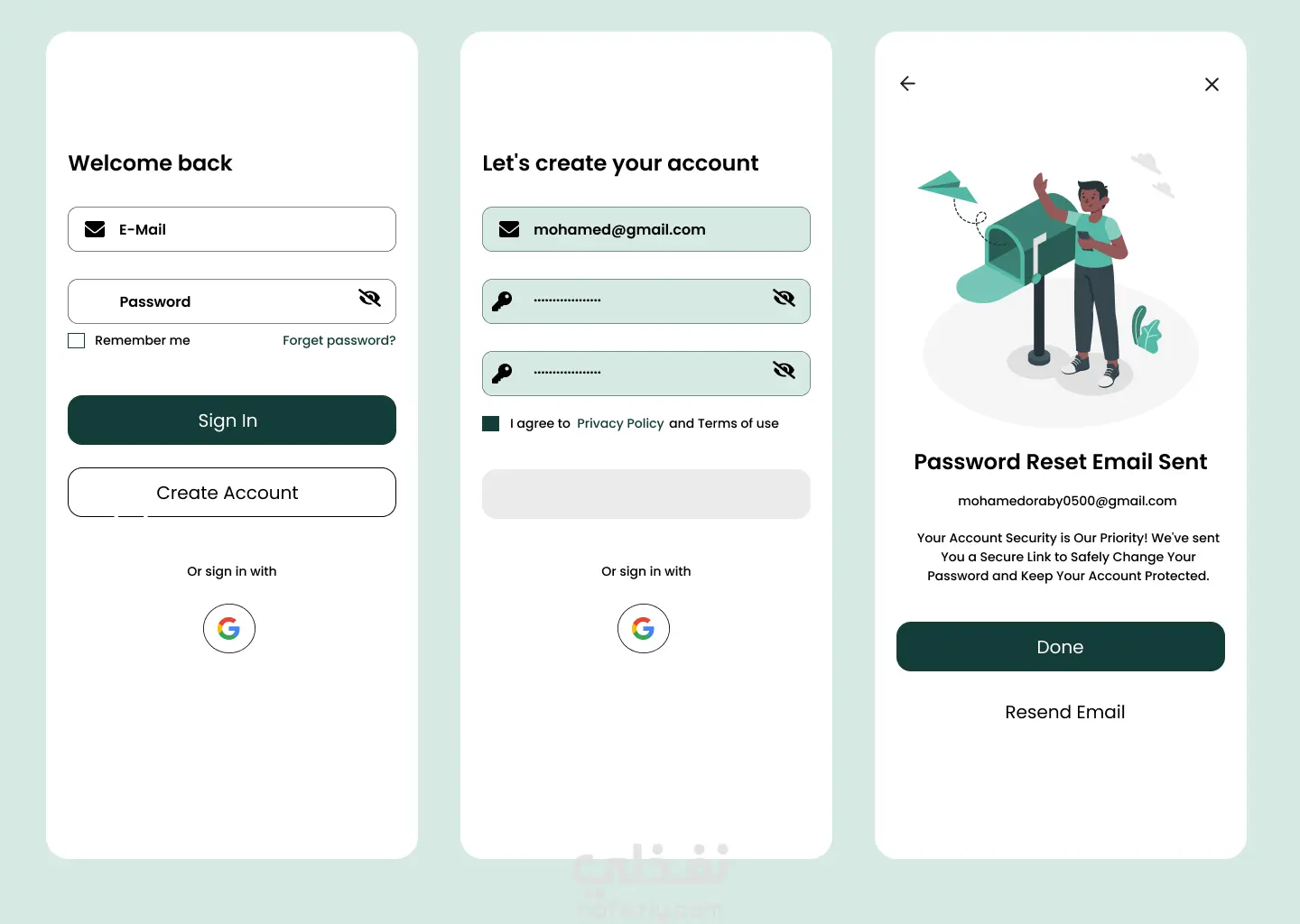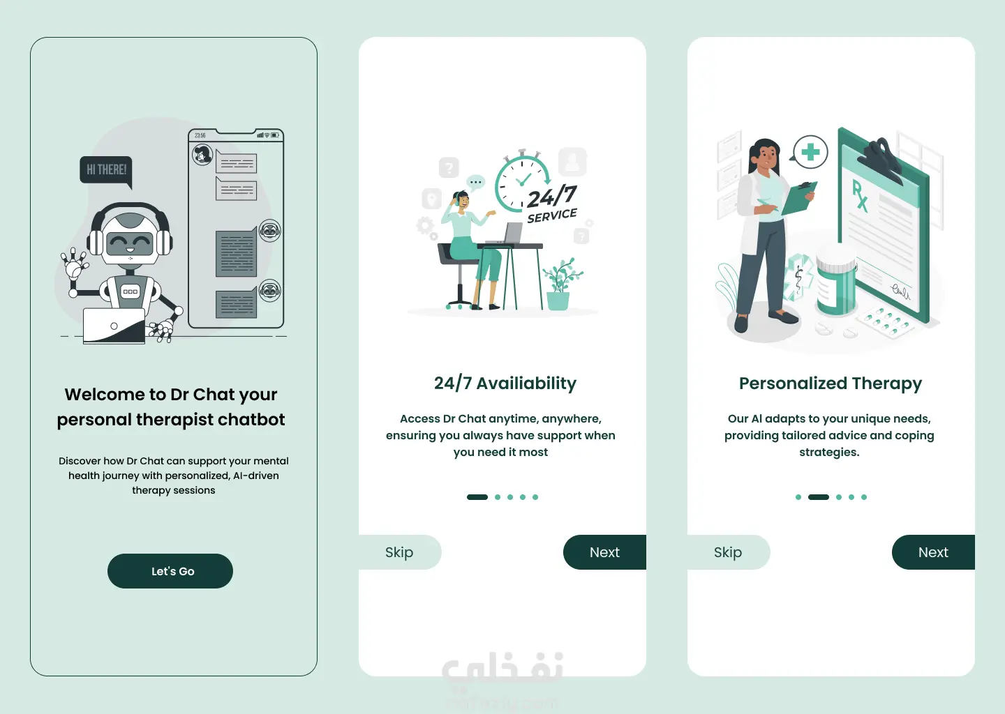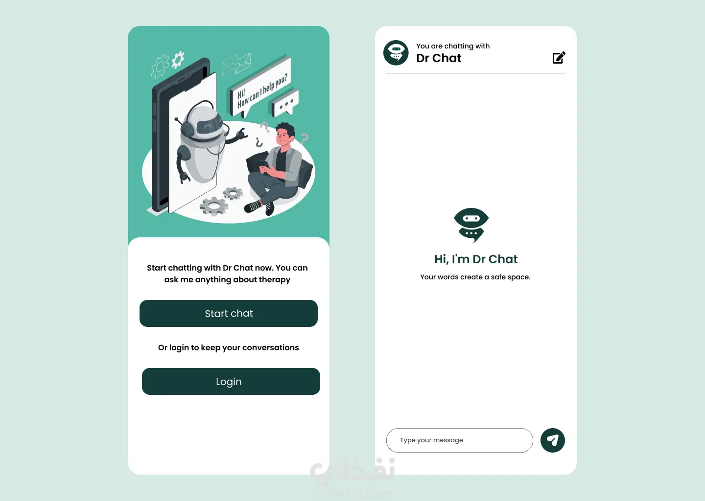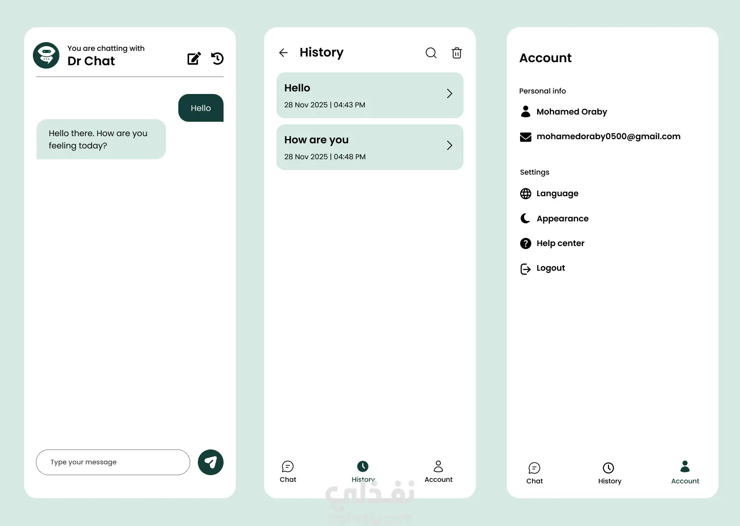 تصميم تطبيق Dr Chat – Therapist Chatbot 1️⃣ الفكرة العامة: تطبيق Dr Chat عبارة عن شات مع معالج نفسي افتراضي (AI-powered) يساعد المستخدمين على التعبير عن مشاعرهم، متابعة حالتهم النفسية، والحصول على إرشادات ودعم بشكل آمن وسلس. 2️⃣ تجربة المستخدم (UX): هدوء وبساطة: واجهة مصممة لتكون مريحة للنظر، مع ألوان هادئة تشجع المستخدم على التفاعل. سهولة التنقل: الانتقال بين الشاشات سلس وواضح لتقليل أي تعقيد أو ارتباك. توجيه المستخدم: أيقونات واضحة وعناوين مباشرة لتسهيل الاستخدام لأول مرة. 3️⃣ واجهة المستخدم (UI): ألوان مريحة: تدرجات ألوان هادئة لتعزيز الشعور بالراحة والأمان النفسي. تصميم نظيف: مساحات بيضاء، خطوط واضحة، ترتيب العناصر بشكل منظم. عناصر تفاعلية: أزرار، شاشات دردشة، بطاقات معلومات، وجداول متابعة مزودة بتصميم جذاب. 4️⃣ شاشات رئيسية: شاشة الترحيب: تقديم سريع للتطبيق مع خيار تسجيل الدخول أو متابعة كضيف. شاشة الدردشة: واجهة شات سلسة مع المعالج الافتراضي، مع إمكانية إرسال نصوص واستقبال ردود فورية. شاشة متابعة الحالة النفسية: جداول ورسوم بيانية لتتبع المزاج والنقاط المهمة بمرور الوقت. الإعدادات والملف الشخصي: إدارة البيانات، تعديل المعلومات الشخصية، والتحكم في التنبيهات. 5️⃣ عناصر تصميمية مهمة: موكابس للأجهزة: لتوضيح كيف سيظهر التطبيق على الهاتف بشكل واقعي. أيقونات واضحة: استخدام أيقونات مألوفة لتسهيل التعرف على الوظائف. خطوط قابلة للقراءة: اختيار خط واضح وسهل القراءة لدعم تجربة المستخدم. تصميم متجاوب: قابل للتكيف مع مختلف أحجام شاشات الهواتف.