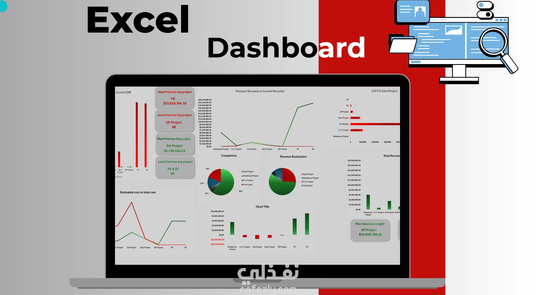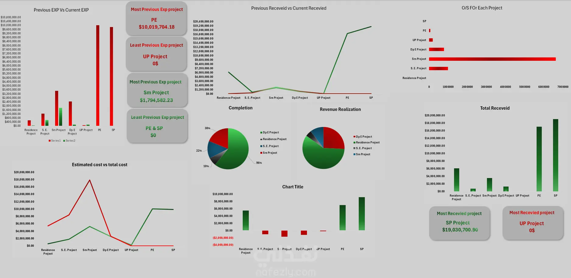 قمت بتصميم لوحة معلومات (Dashboard) احترافية باستخدام Excel لعرض وتحليل البيانات المالية الخاصة بعدة مشاريع في شكل بصري واضح ومنظم. تحتوي اللوحة على رسومات بيانية توضح المقارنات بين المصروفات السابقة والحالية، والإيرادات المستلمة، ونسب الإنجاز، بالإضافة إلى تحليل التكلفة التقديرية مقابل التكلفة الفعلية، والرصيد المتبقي لكل مشروع. تم إبراز أهم المؤشرات المالية مثل أعلى وأقل المشاريع من حيث الإنفاق أو الإيرادات، مع تصميم متناسق يسهل قراءة البيانات واتخاذ القرارات. هذا العمل يعكس مهارتي في تحليل البيانات وبناء لوحات معلومات احترافية في Excel تساعد في تبسيط المعلومات المالية وعرضها بطريقة عملية وجذابة.