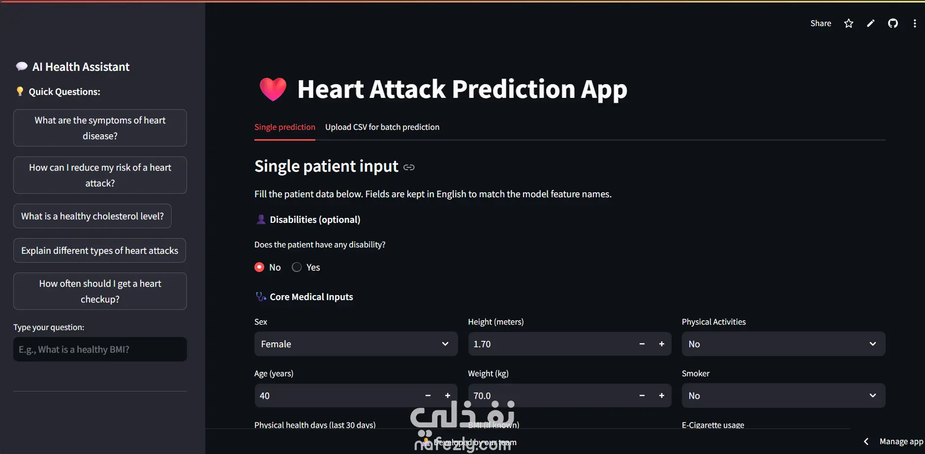 نوع المشروع: رعاية صحية / تعلم آلي / تحليلات تنبؤية الفكرة: هذا المشروع يهدف إلى تطوير نظام يعتمد على التعلم الآلي لتوقع خطر الإصابة بالنوبات القلبية بناءً على بيانات صحية شخصية. يمكن للمستخدم إدخال معلوماته الصحية مثل العمر، مؤشر كتلة الجسم، عادات التدخين، النشاط البدني، والتاريخ الطبي، ليحصل فوراً على تقدير لمخاطر النوبة القلبية. مميزات المشروع: توقع مبكر لمخاطر النوبات القلبية بدقة تصل إلى 91% عرض بصري للعوامل الصحية المؤثرة على المستخدم واجهة تفاعلية وسهلة الاستخدام باستخدام Streamlit روبوت دردشة صحي يشرح النتائج بلغة بسيطة باستخدام Gemini API التقنيات المستخدمة: Python | Pandas | NumPy | Scikit-learn | Streamlit | Gemini API | SMOTE للتوازن بين الفئات النتيجة: أداة سريعة وموثوقة لتقييم صحة القلب، تساعد المستخدم على فهم العوامل المؤثرة واتخاذ قرارات صحية مستنيرة.
