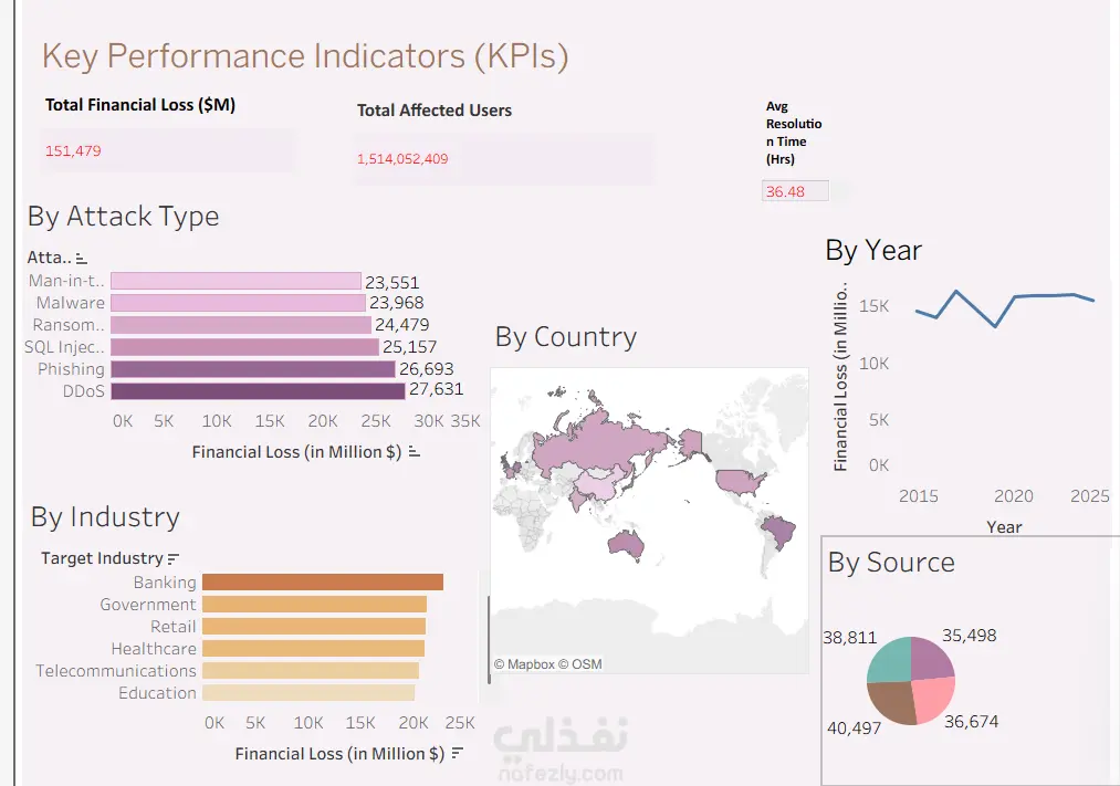لوحة تفاعلية متكاملة لتحليل بيانات الهجمات الإلكترونية. تعرض اللوحة أهم المؤشرات مثل: أنواع الهجمات، مصادر التهديد، الصناعات المستهدفة، ونقاط الضعف الأمنية، بالإضافة إلى التحليل الزمني والخرائط التفاعلية. تم تصميم اللوحة بشكل منظم وسهل الاستخدام لتقديم رؤية واضحة تساعد في اتخاذ قرارات أمنية مبنية على البيانات.