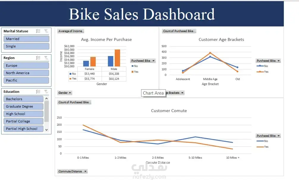 لوحة معلومات تفاعلية (Interactive Dashboard) تظهر مبيعات الدراجات وتأخذ في الاعتبار جنس العميل ومنطقته ودخله ووسيلة تنقله، باستخدام برنامج Excel.