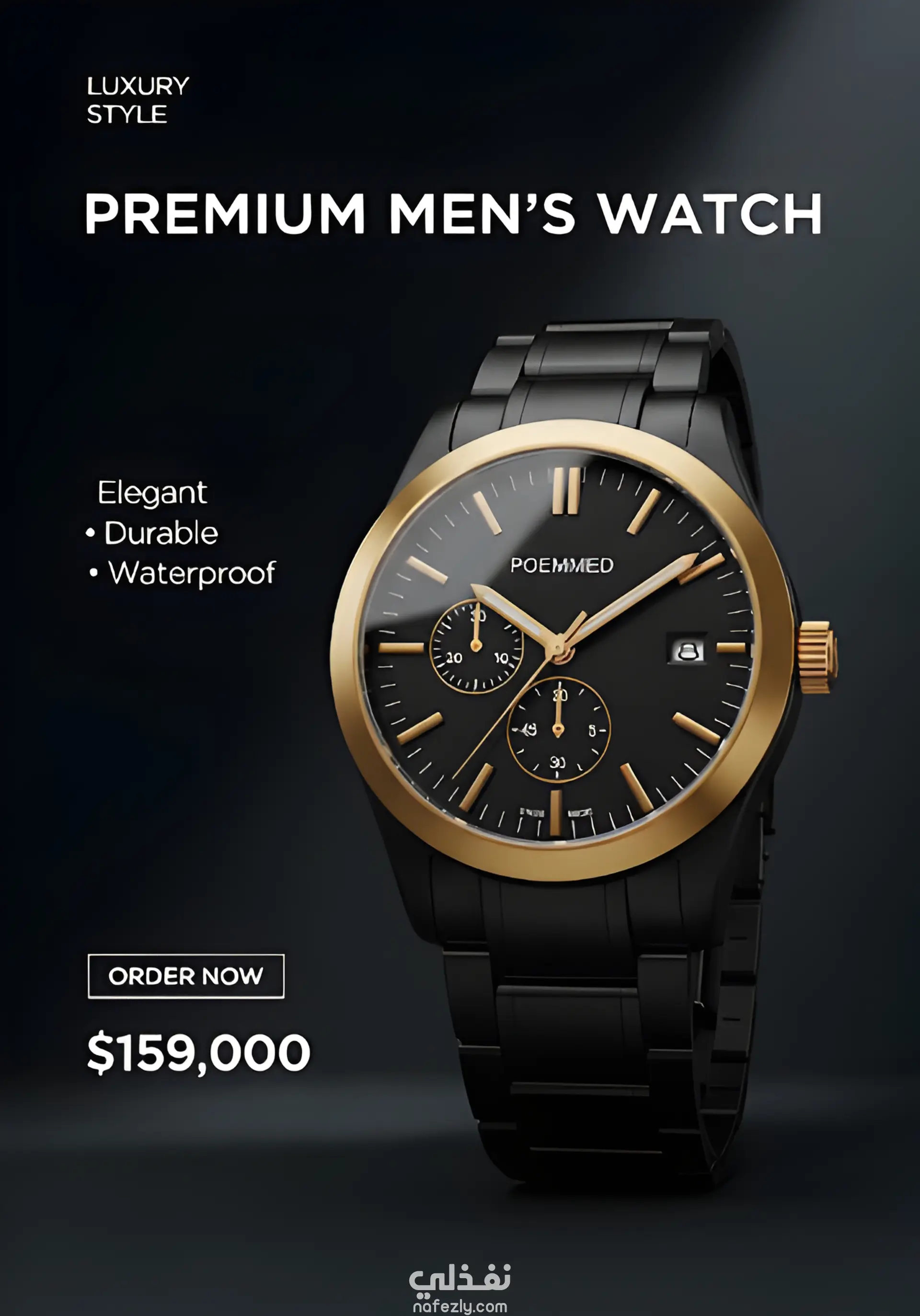 الدقة المتناهية (Precision Focus): يتمحور التصميم حول ساعة "Poemmed" الفاخرة. لقد تم التعامل معها كقطعة فنية وهندسية، حيث يبرز اللون الأسود المطفي (Matte Black) والذهبي المصقول (Polished Gold) ليعكسا معايير الجودة التي لا تقبل المساومة، تمامًا كما يتوقع عميلك العملاق في تنفيذ مشاريعه.