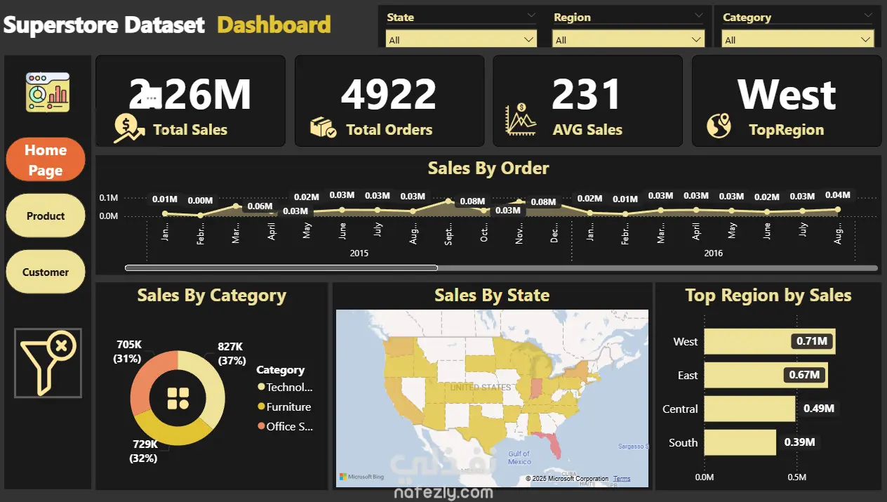تم تطوير لوحة بيانات احترافية باستخدام Power BI لتحليل أداء المبيعات في متجر متعدد الفئات والمناطق. تتيح اللوحة للمستخدمين استكشاف البيانات بسهولة من خلال فلاتر ديناميكية تشمل الولايات، المناطق، والفئات، مع تمثيل بصري جذاب يساعد في اتخاذ قرارات مبنية على البيانات. **مكونات اللوحة:** - إجمالي المبيعات: 2.26 مليون دولار - عدد الطلبات: 4922 - متوسط قيمة الطلب: 231 دولار - أفضل منطقة مبيعًا: الغرب - توزيع المبيعات حسب رقم الطلب، الفئة، والولاية - خرائط حرارية لأداء الولايات الأمريكية - مقارنة المناطق حسب حجم المبيعات - تحليل الفئات الثلاث: المستلزمات المكتبية، الأثاث، التكنولوجيا **الهدف من العمل:** تمكين فرق الإدارة والمبيعات من فهم الأداء العام، تحديد المناطق والفئات الأكثر ربحية، وتحسين استراتيجيات التسويق والتوزيع بناءً على رؤى دقيقة وتفاعلية.