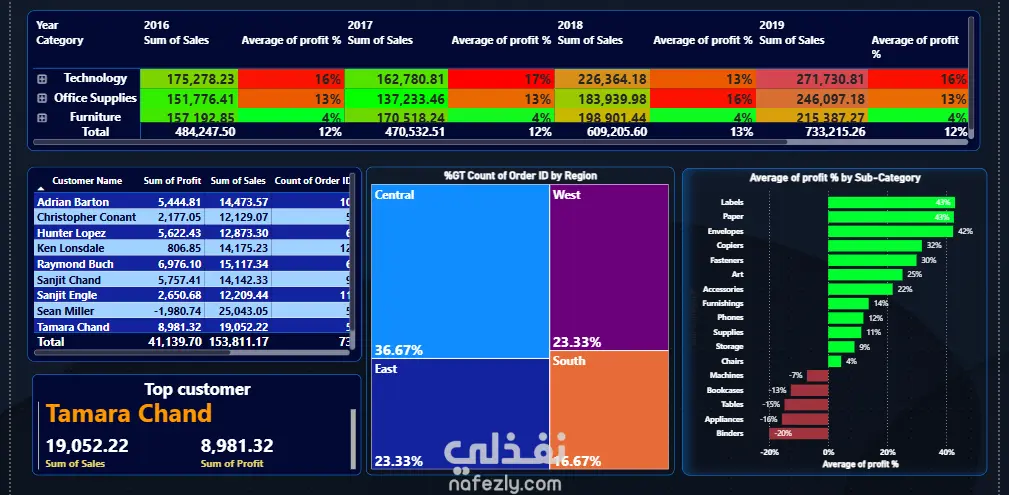 تم تصميم لوحة بيانات احترافية باستخدام Power BI لعرض وتحليل أداء الطلبات والمبيعات عبر عدة أبعاد زمنية وجغرافية وتشغيلية. تتيح اللوحة للمستخدمين استكشاف البيانات بسهولة من خلال فلاتر ديناميكية تشمل السنوات، الفئات، المناطق، وأنماط الشحن، مع تمثيل بصري غني يساعد في اتخاذ قرارات مبنية على البيانات. **مكونات اللوحة:** - إجمالي الطلبات، متوسط الخصم، إجمالي الربح والكمية - تحليل شهري للمبيعات والأرباح من 2016 إلى 2019 - توزيع المبيعات حسب الفئة، الشريحة، ونمط الشحن - خرائط حرارية لأداء الولايات الأمريكية في المبيعات والأرباح - أفضل 10 منتجات حسب حجم المبيعات - تحليل مبيعات العملاء حسب الفئة **الهدف من العمل:** تمكين فرق المبيعات والإدارة من فهم الأداء العام، تحديد الاتجاهات، وتحسين استراتيجيات التسويق والتوزيع بناءً على رؤى دقيقة وتفاعلية.