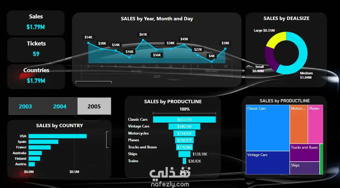 **وصف لوحة البيانات – تحليل شامل للمبيعات** تعرض هذه اللوحة التفاعلية نظرة شاملة على أداء المبيعات عبر عدة أبعاد زمنية وجغرافية ومنتجاتية. تم تصميمها باستخدام Power BI لتوفير تجربة تحليلية سلسة تساعد في اتخاذ قرارات استراتيجية مبنية على البيانات. **أبرز عناصر التحليل:** - إجمالي المبيعات: **1.79 مليون دولار** موزعة على **59 صفقة** في عدة دول - تحليل زمني للمبيعات حسب **السنة، الشهر، واليوم** - توزيع المبيعات حسب **حجم الصفقة** (كبيرة، متوسطة، صغيرة) - مقارنة أداء الدول مثل **الولايات المتحدة، فرنسا، إسبانيا، أستراليا، وإيطاليا** - تحليل مفصل حسب **خط الإنتاج** (سيارات كلاسيكية، دراجات نارية، طائرات، وغيرها) **الهدف من اللوحة:** تمكين أصحاب القرار من فهم الاتجاهات، تحديد المنتجات والدول الأكثر ربحية، وتحسين استراتيجيات التسويق والمبيعات بناءً على بيانات دقيقة ومصنفة.
