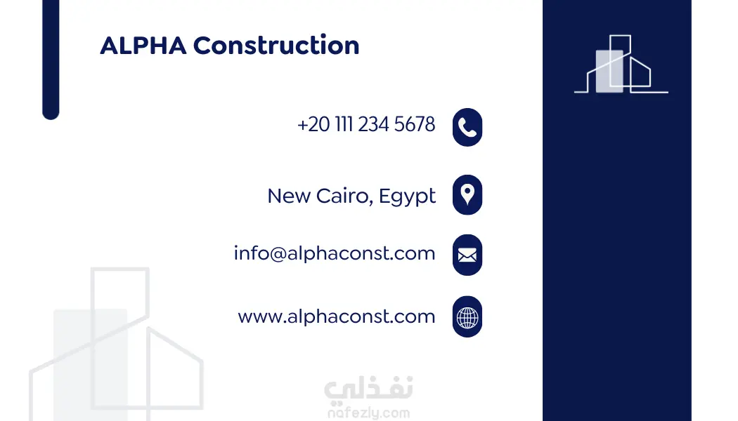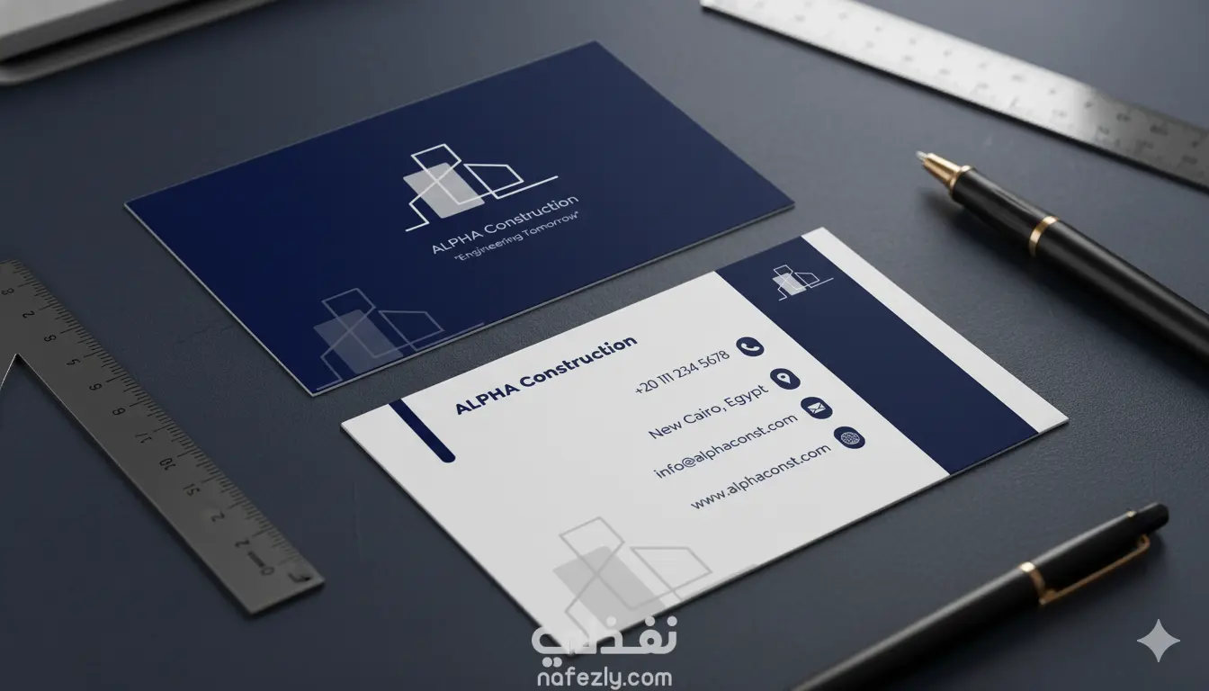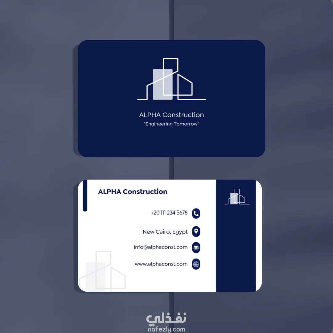 هذا المشروع عبارة عن تصميم بطاقة أعمال احترافية لشركة Alpha Construction، تم التركيز فيه على الجمع بين البساطة والاحترافية لتعكس هوية الشركة الهندسية. التصميم يعتمد على الألوان الداكنة والهادئة مع لمسات بيضاء تبرز شعار الشركة بطريقة أنيقة وواضحة.