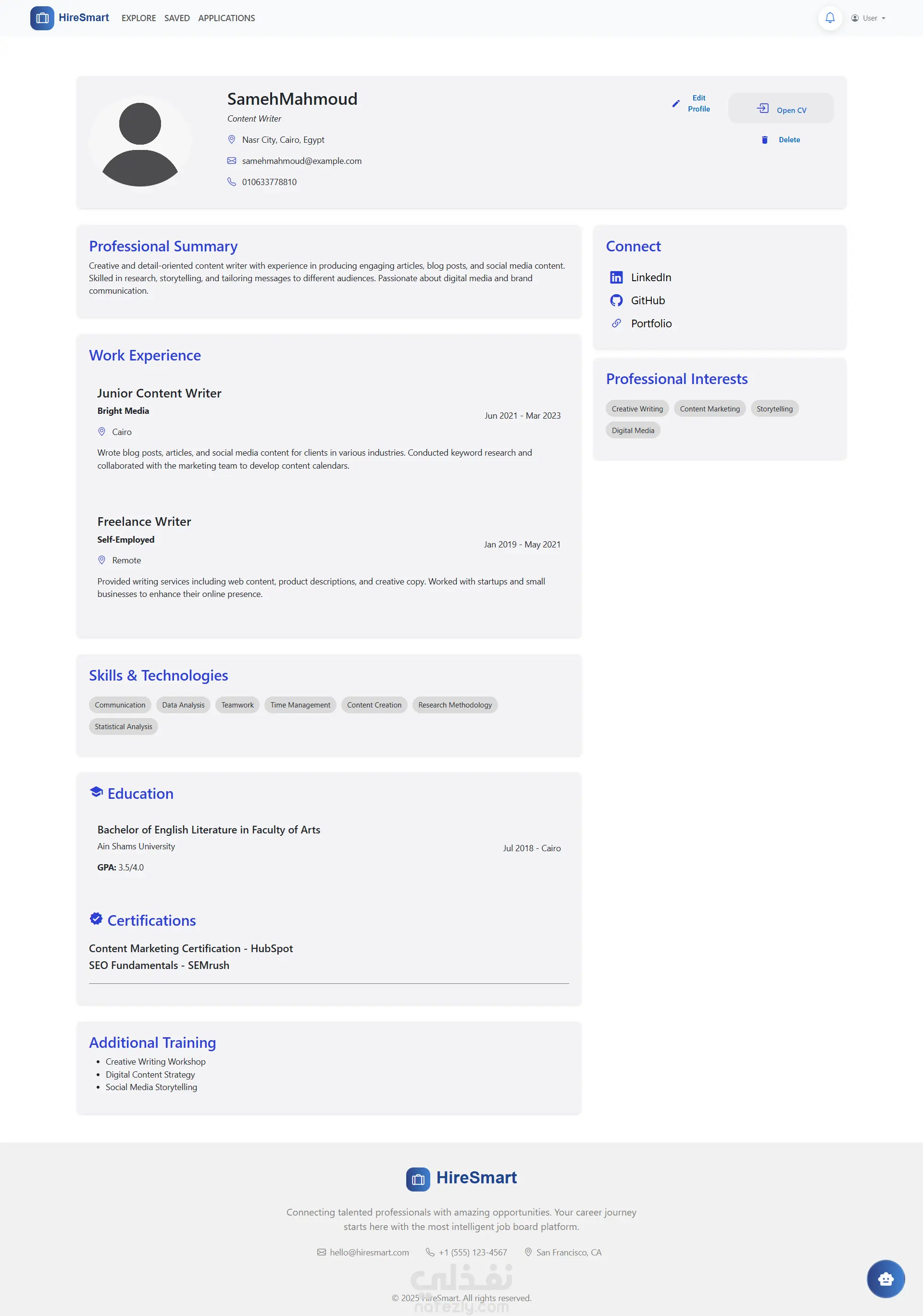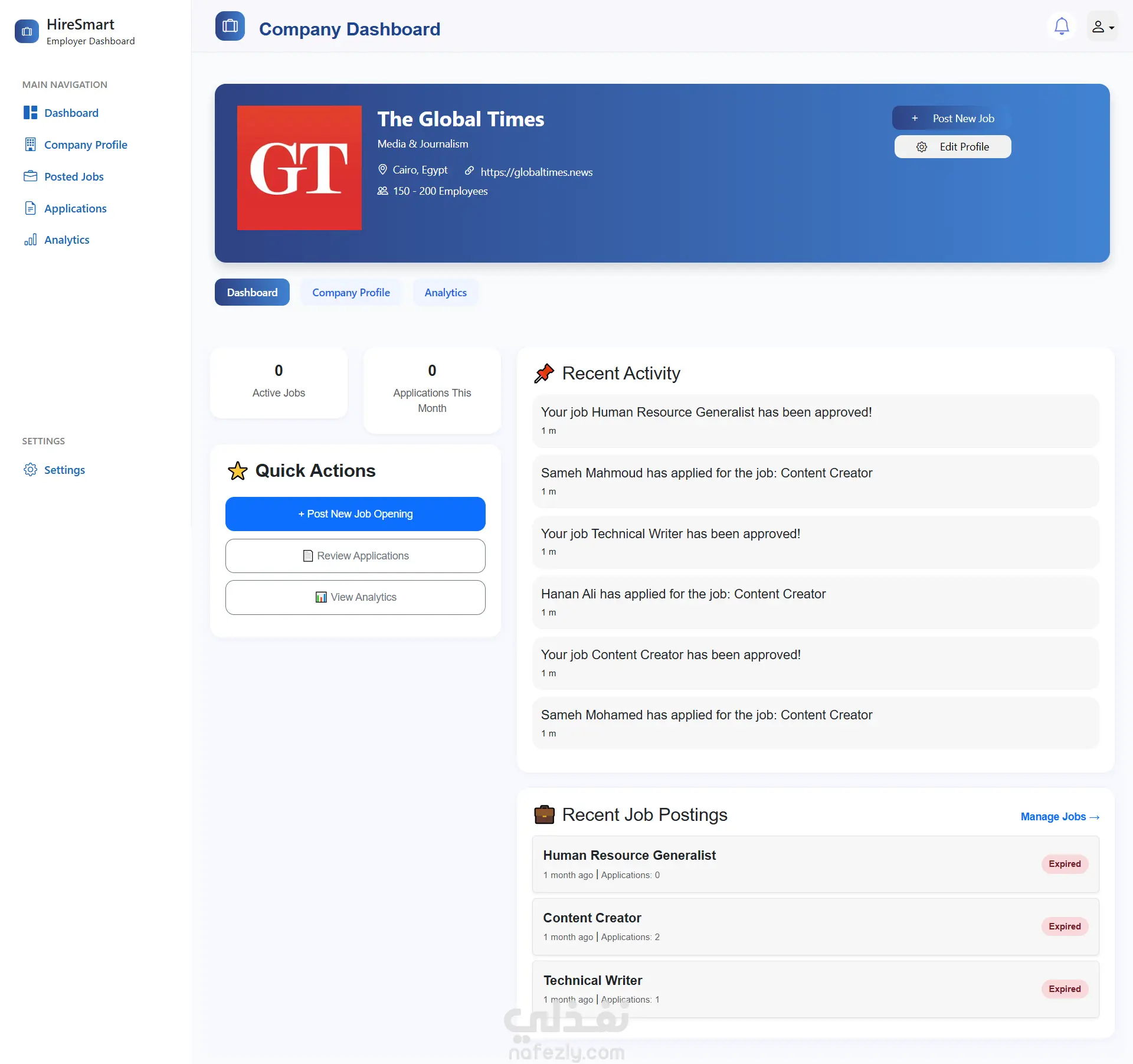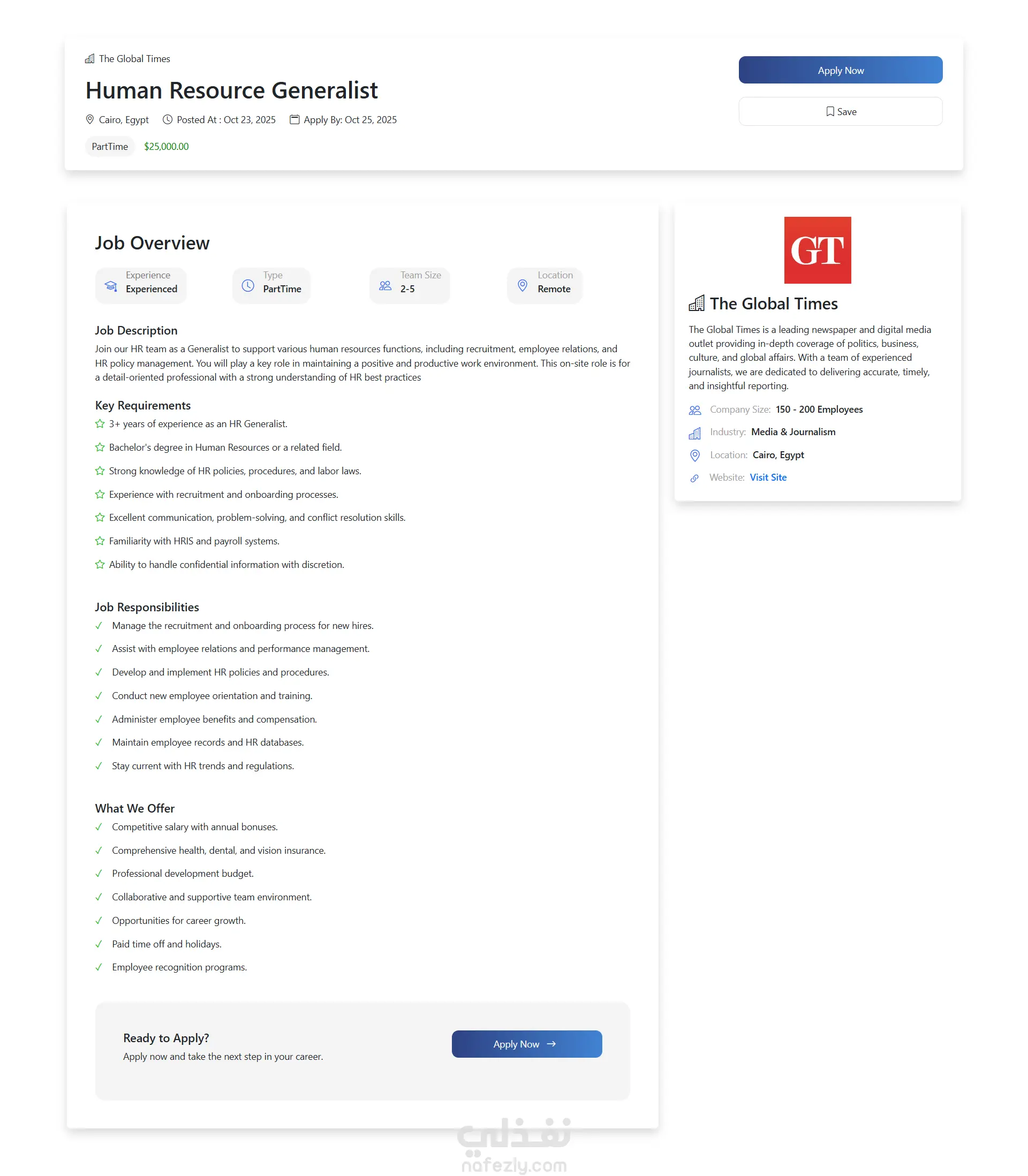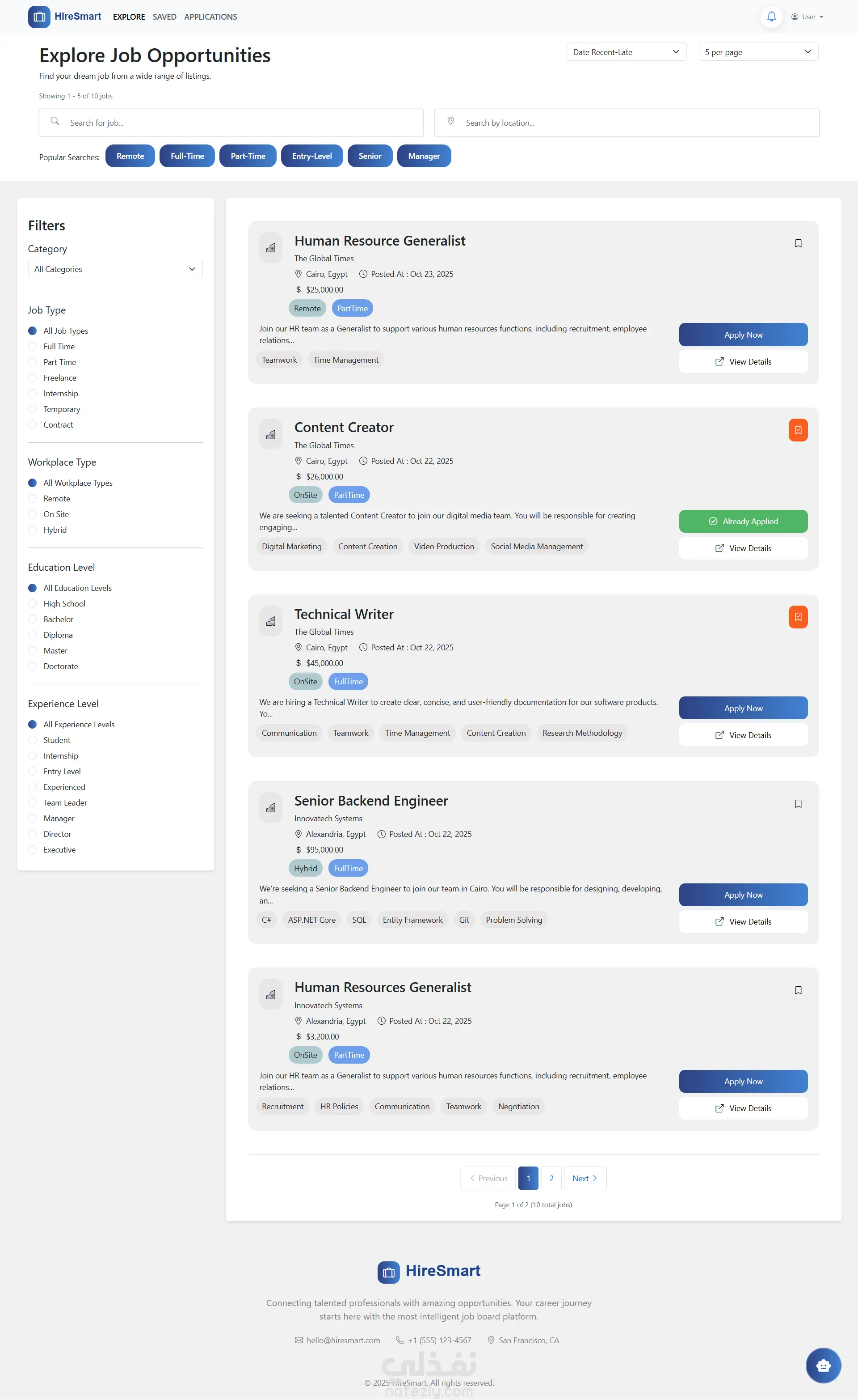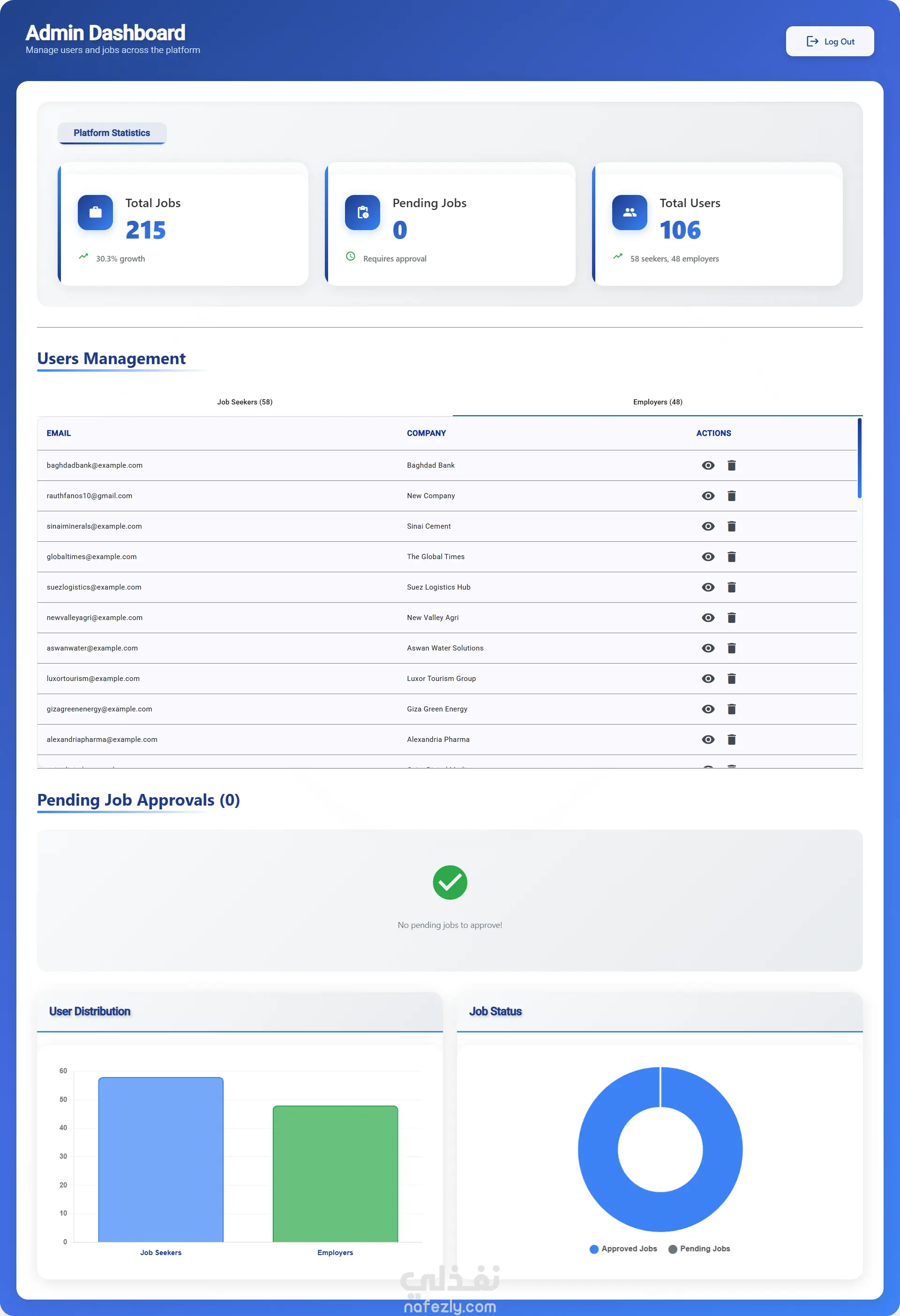 مشروع Job Board Platform هو منصّة توظيف متكاملة قمت بتطويرها لربط أصحاب الشركات بالباحثين عن عمل من خلال نظام مرن يعتمد على التسجيل والصلاحيات المختلفة لكل مستخدم. يتيح النظام لصاحب الشركة إضافة الوظائف وإدارتها، بينما يمكن للباحثين عن عمل إنشاء حساب، وإدارة ملفهم الشخصي، والبحث عن الوظائف والتقديم عليها. يتكوّن المشروع من واجهة خلفية (Backend) مبنية باستخدام ASP.NET Core Web API، وواجهة أمامية (Frontend) باستخدام Angular، بالإضافة إلى قاعدة بيانات مصممة بشكل احترافي باستخدام Entity Framework Core و SQL Server. أهم خصائص المشروع تشمل: 1- نظام تسجيل دخول وتسجيل مستخدمين بصلاحيات مختلفة (Employer / Job Seeker) باستخدام JWT Authentication 2- إنشاء وتعديل وحذف وعرض الوظائف 3- نظام كامل لتقديم طلبات التوظيف ومتابعة حالتها 4- صفحة ملف شخصي لكل مستخدم مع إمكانية تحديث البيانات 5- البحث المتقدم والفلترة حسب المسمى الوظيفي أو المجال أو الخبرة 6- تصميم واجهة مستخدم متجاوبة وسهلة الاستخدام 7- قاعدة بيانات مُنظمة وفق أفضل معايير التصميم