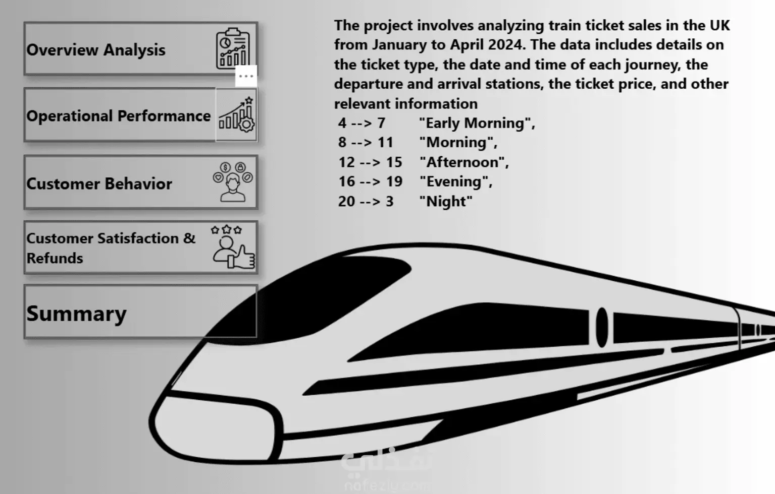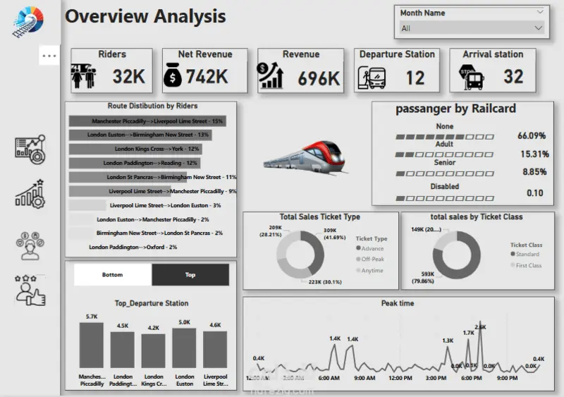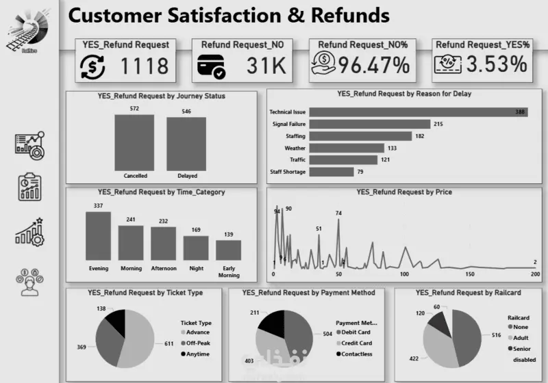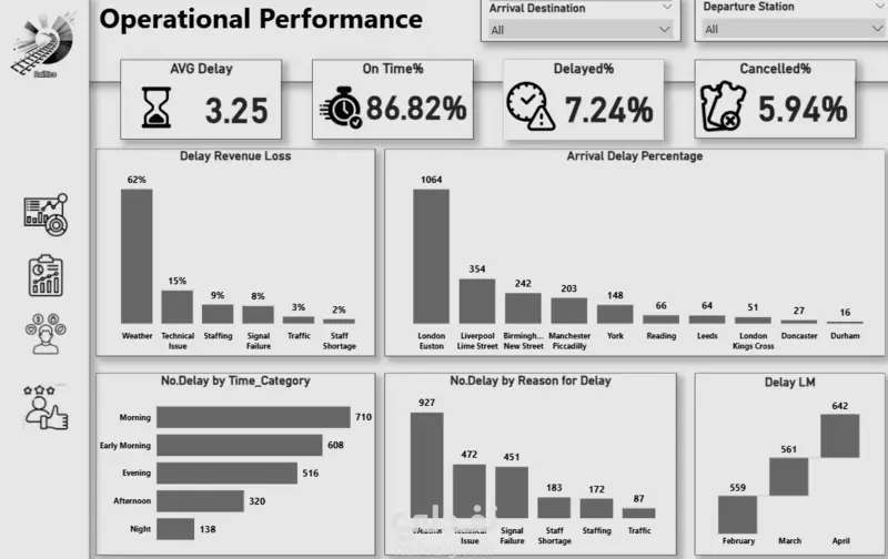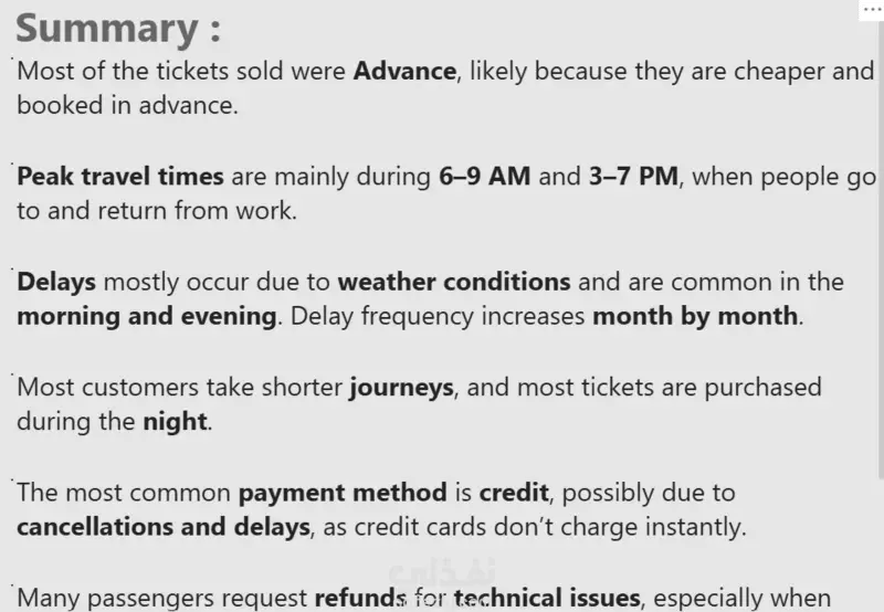 المشروع كان عبارة عن تحليل بيانات القطارات في المملكة المتحدة (UK Rail Dataset) بهدف استخراج رؤى واضحة عن الأداء، التأخيرات، عدد الرحلات، مستوى الازدحام، وأكثر.