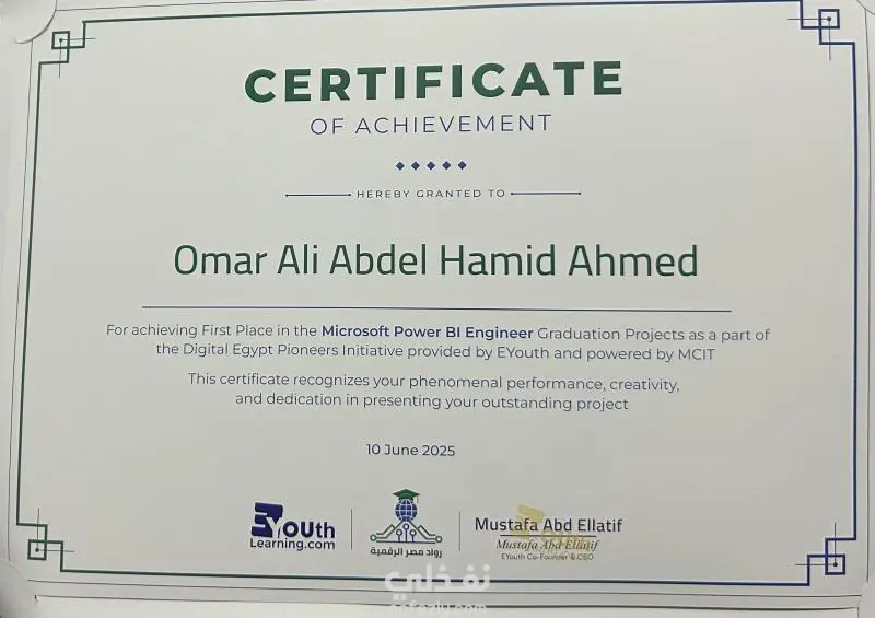 عملت على مشروع عملي ضمن التدريب الخاص بمبادرة رواد مصر (DEPI) حيث حصلت على المركز الأول في مسار Microsoft Power BI.