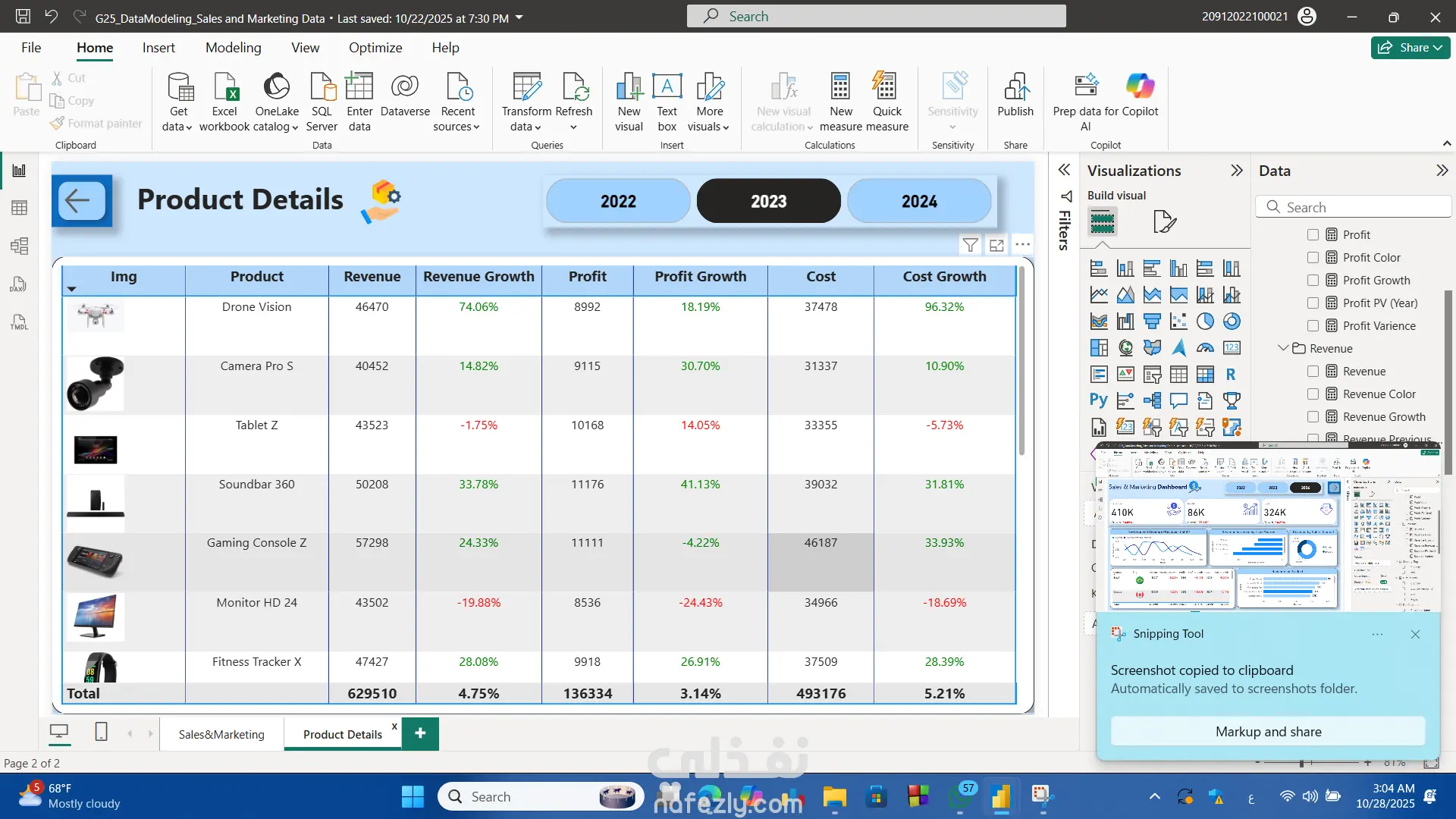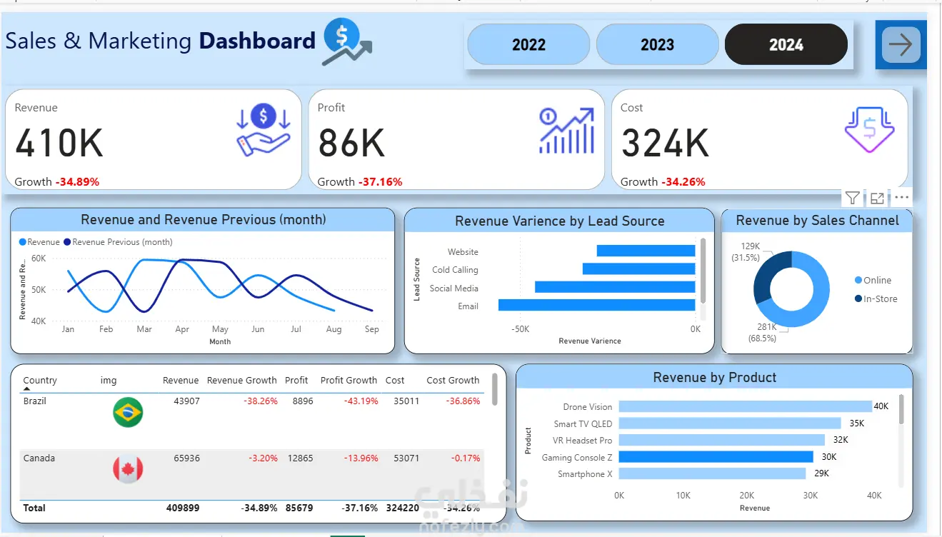 أعرض لكم لوحة تحكم Power BI Dashboard احترافية تم تصميمها لعرض بيانات المبيعات والمنتجات والدول والأرباح بشكل واضح وسهل الفهم. الداشبورد تحتوي على: 📌 أهم عناصر العمل بطاقات KPIs لعرض (Revenue – Profit – Cost – Growth). رسوم بيانية احترافية (Line – Bar – Donut – Stacked Bars). تحليل تفاعلي حسب السنوات (2022 – 2023 – 2024). جدول شامل للمنتجات مع: Revenue – Profit – Cost – Growth. جدول مقارن للدول مع صور الأعلام. تحليل المبيعات حسب قنوات البيع (Online / In-Store). تحليل حسب مصادر العملاء (Lead Source). تصميم جذاب وألوان متناسقة وواجهة سهلة الاستخدام. 📌 للبحث في محركات البحث لوحات Power BI – تصميم Dashboard – KPIs – تحليل مبيعات – تقارير تفاعلية – Data Visualization – تقارير Power BI جاهزة. العمل مناسب للشركات، التقارير الأسبوعية، متخذي القرار، والمشاريع الأكاديمية.