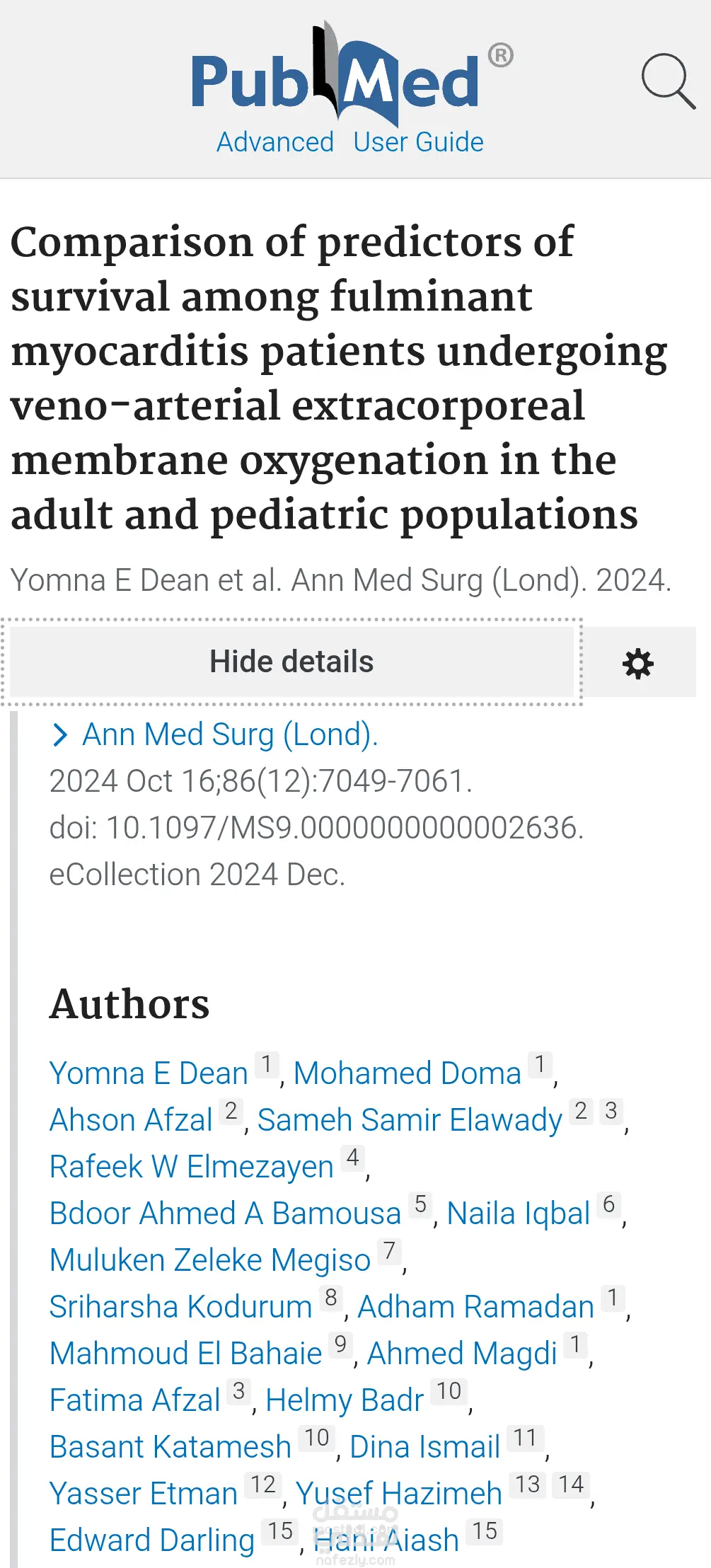 هذا البحث المنشور بعنوان Comparison of predictors of survival among fulminant myocarditis patients undergoing veno‑arterial extracorporeal membrane oxygenation in the adult and pediatric populations (PMID: 39649930) يوضّح خبرتي في تصميم وتحليل دراسات طبية سريرية ومقارنة بين مجموعات، واستخدام بيانات من الدراسات المنشورة، واستخلاص الاستنتاجات السريرية المهمة.