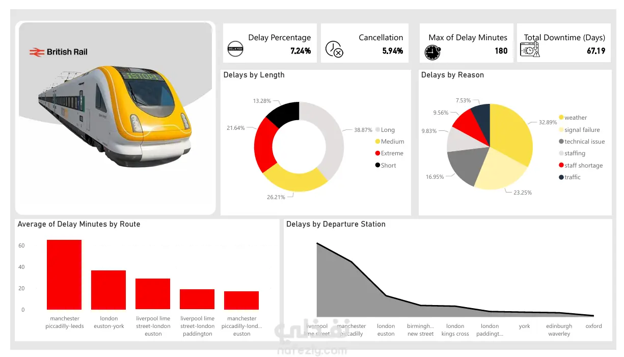 الهدف: تطوير لوحة مؤشرات تقنية لمراقبة كفاءة البنية التحتية (Infrastructure Reliability) وتحليل أسباب توقف الخدمة، مع التركيز على الجانب الهندسي لتقليل فترات التعطل. الإنجازات والمهام: إجراء تحليل السبب الجذري (Root Cause Analysis) لمعرفة مسببات التأخير، والتمييز بين الأعطال الفنية (Technical Issues) والعوامل الخارجية مثل الطقس. حساب تأثير التأخيرات رقمياً (مثل إجمالي وقت التوقف: 67.19 يوم) لتحديد أولويات الصيانة. تصنيف حدة التأخير (من قصير المدى إلى حاد) للمساعدة في تحسين جودة الخدمة. الأدوات المستخدمة: Power BI, KPI Tracking, Statistical Analysis.
