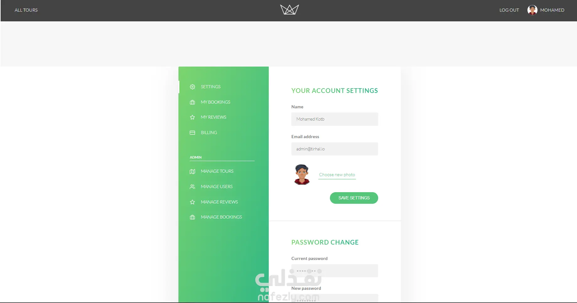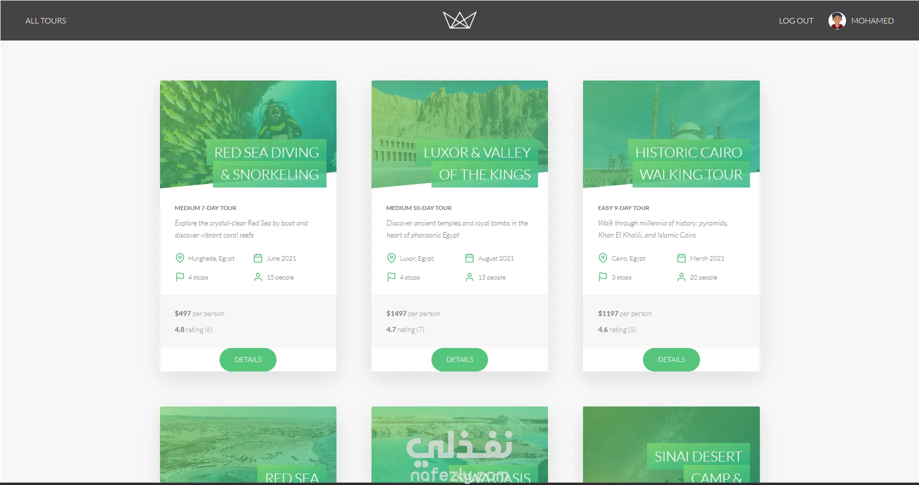 منصة متكاملة لحجز الرحلات السياحية عبر الويب، تتيح للمستخدمين استعراض الرحلات، الحجز، والدفع الإلكتروني بشكل آمن وسلس. دوري في المشروع: تطوير الواجهة الخلفية (Backend API) باستخدام Node.js وExpress.js تصميم قاعدة البيانات باستخدام MongoDB وتطبيق استعلامات المواقع الجغرافية (Geospatial Queries) تنفيذ نظام تسجيل الدخول الآمن باستخدام JWT وإدارة الأدوار (مدير, مرشد, مستخدم) دمج نظام الدفع عبر الإنترنت باستخدام Stripe API بناء نظام آمن لإرسال رسائل البريد الإلكتروني للمستخدمين إنشاء واجهة أمامية باستخدام Pug لتجربة مستخدم تفاعلية وسريعة