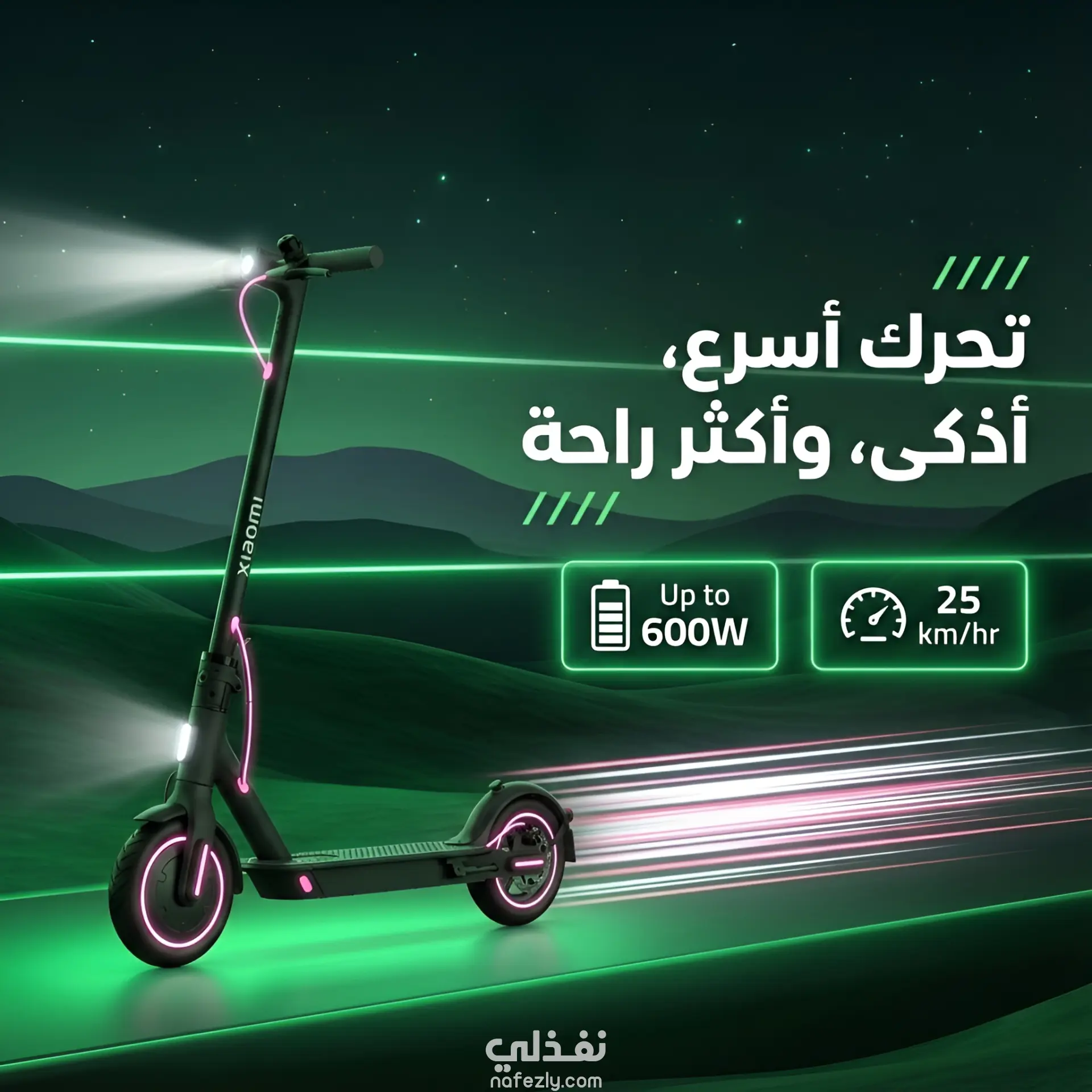 في وسط الصورة إلى اليسار يوجد **سكوتر كهربائي جديد حديث** رياضي، واقفة على أرض زرقاء مضيئة. تحتوي السكوتر على إضاءة أمامية LED قوية بيضاء، وإضاءات وردية صغيرة على حواجز وخطوط الركاب. يظهر على شعار **Xiaomi** مكتوب رأسيًا.