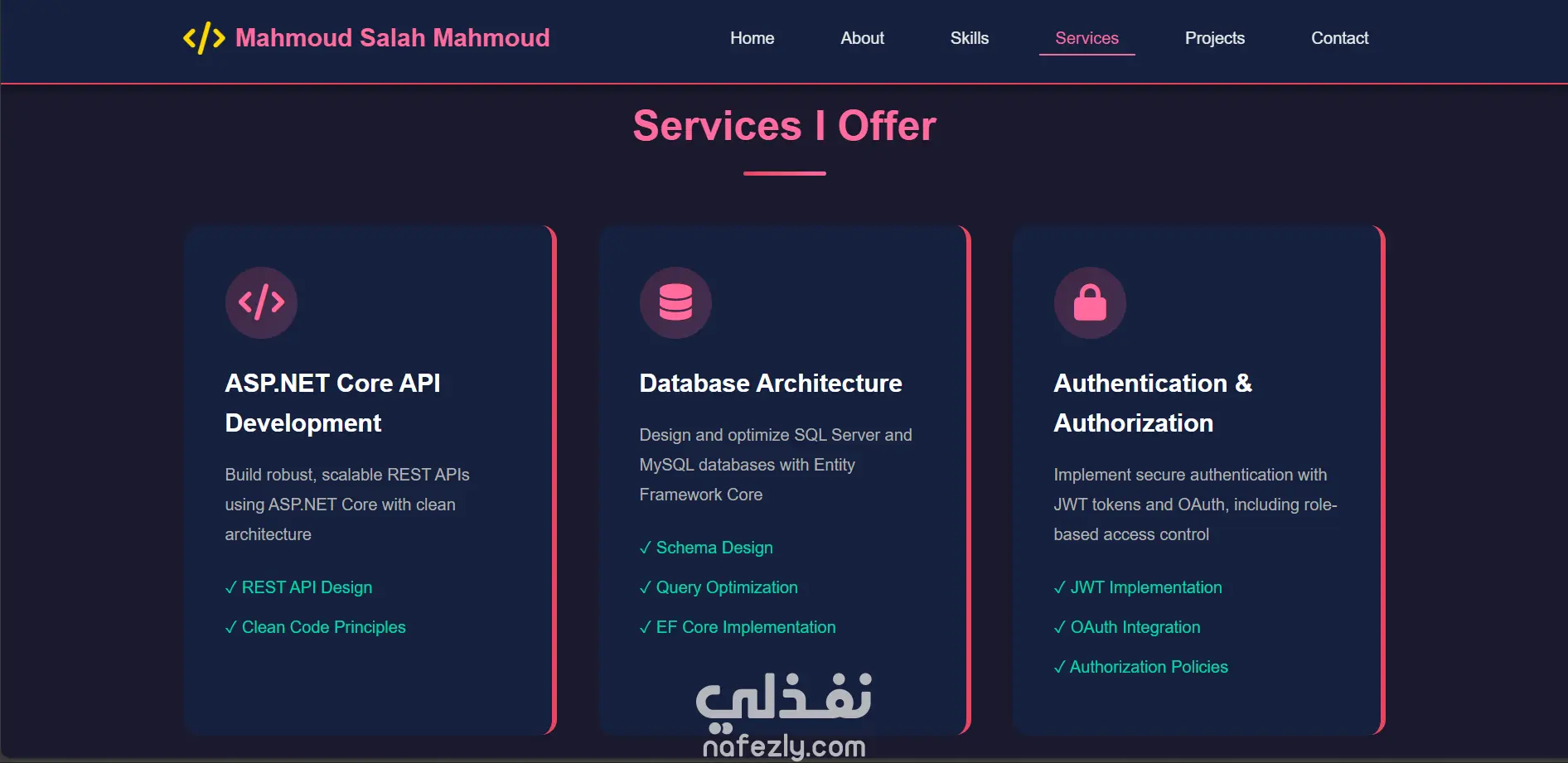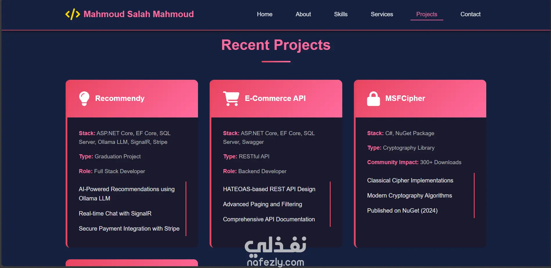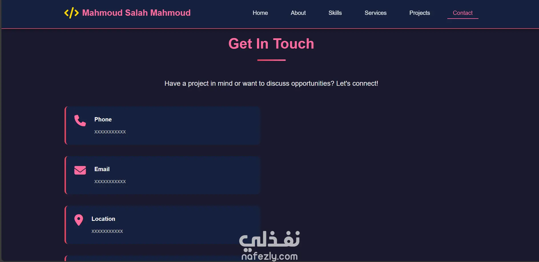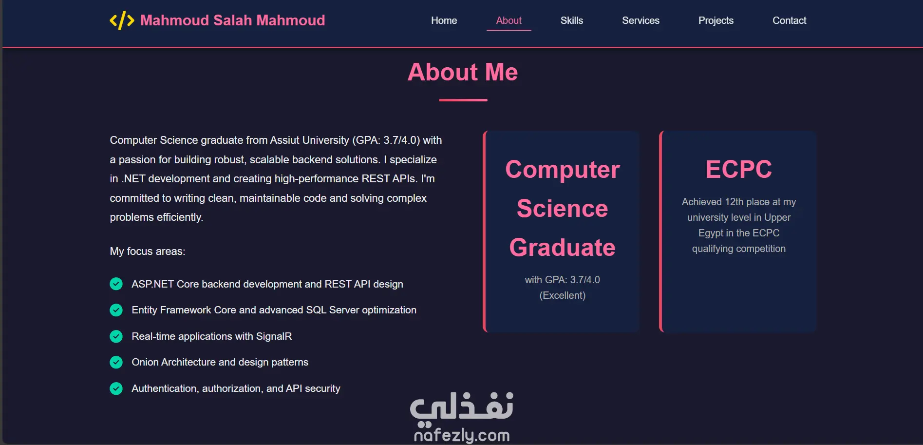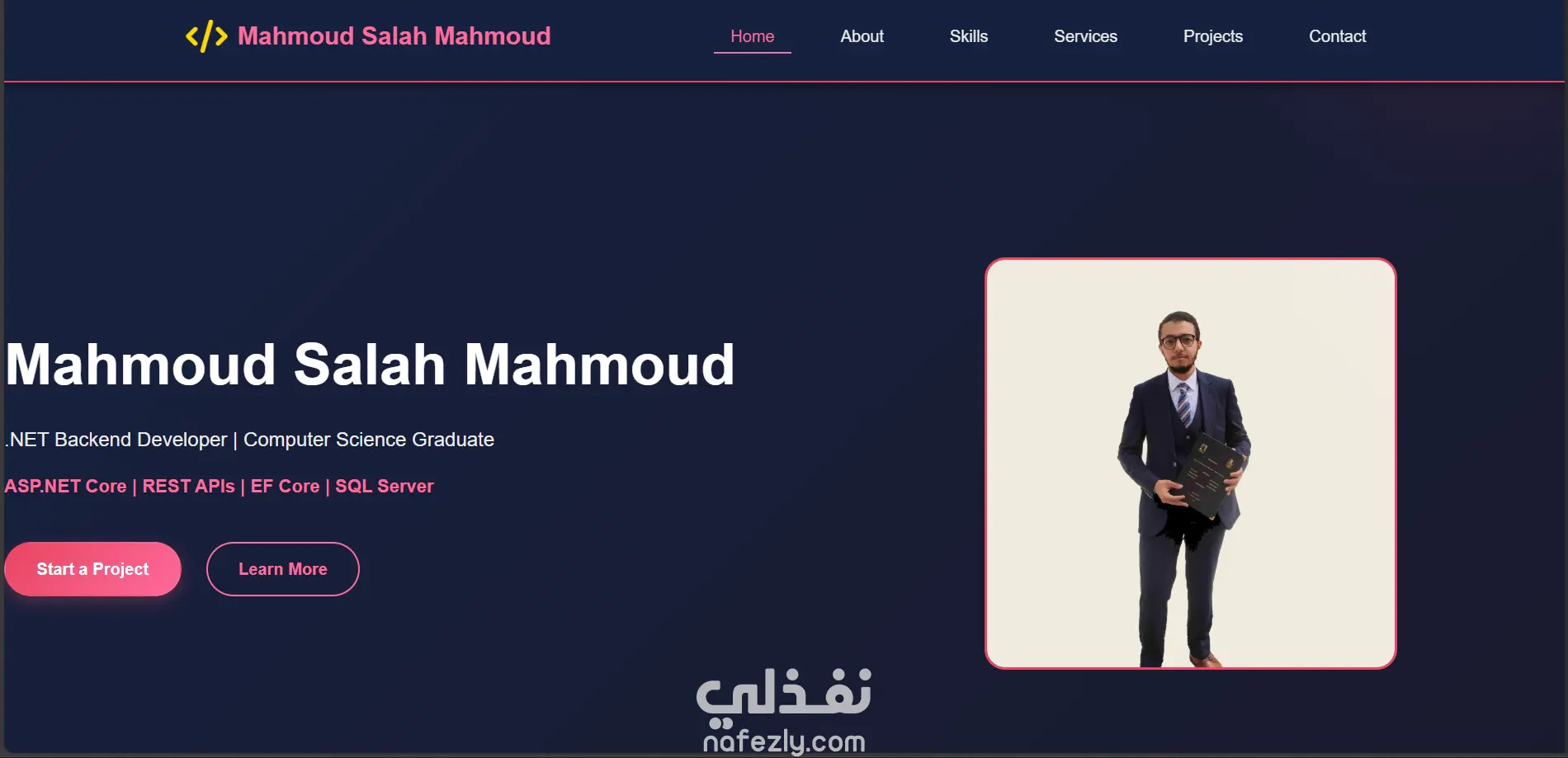 البورتفوليو (Portfolio) هو الدليل الأكثر فعالية لمهاراتك، حيث يترجم قدراتك النظرية إلى إنجازات عملية ملموسة. إنه يبني ثقة فورية مع العميل اذا كنت تعمل في أي مجال إبداعي أو تقني او تدريس، فأنت بحاجة إلى واجهة عرض تليق بمهاراتك. هذا البورتفوليو احترافي ومبتكر يجمع بين الجمالية والوظيفة مميزات العمل بورتفوليو متجاوب (Responsive) بنية منظمة وسهلة التصفح تنظيم المشاريع والخبرات وقسم "من أنا" بطريقة منطقية تجعل الوصول للمعلومات سريعاً ومريحاً. تكامل وسائل التواصل