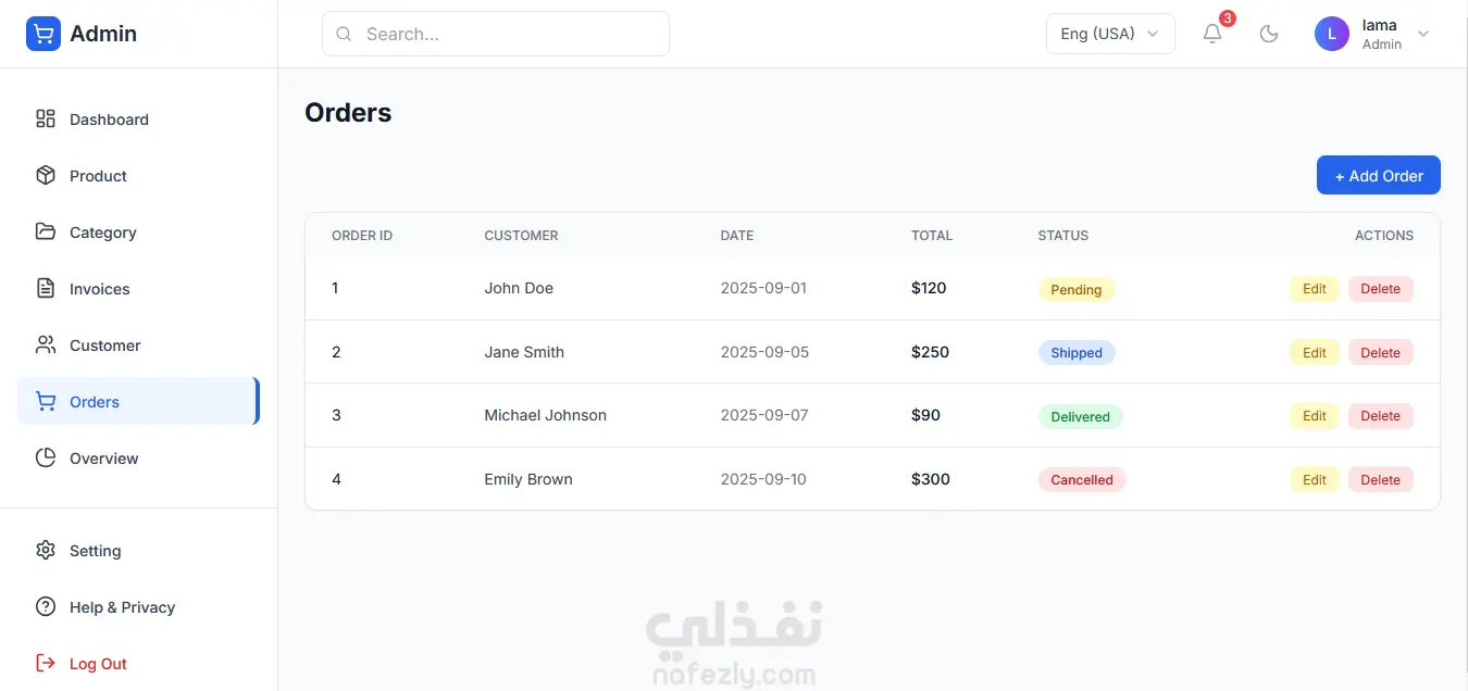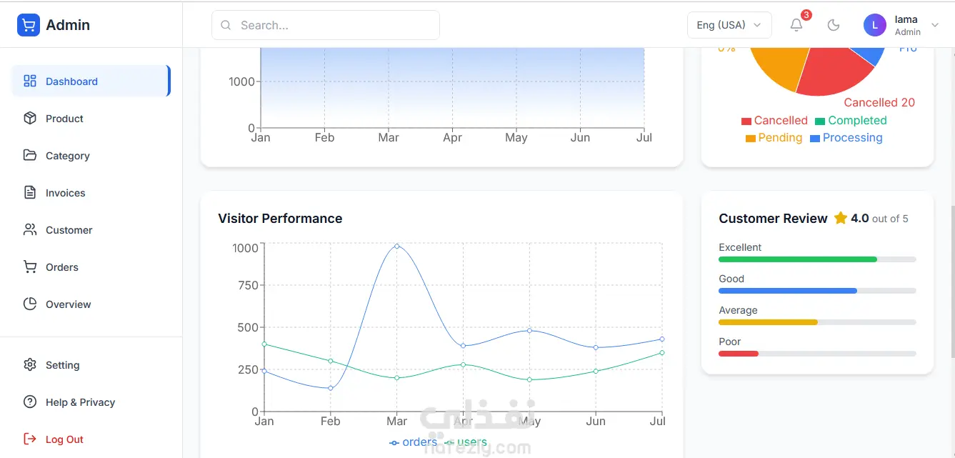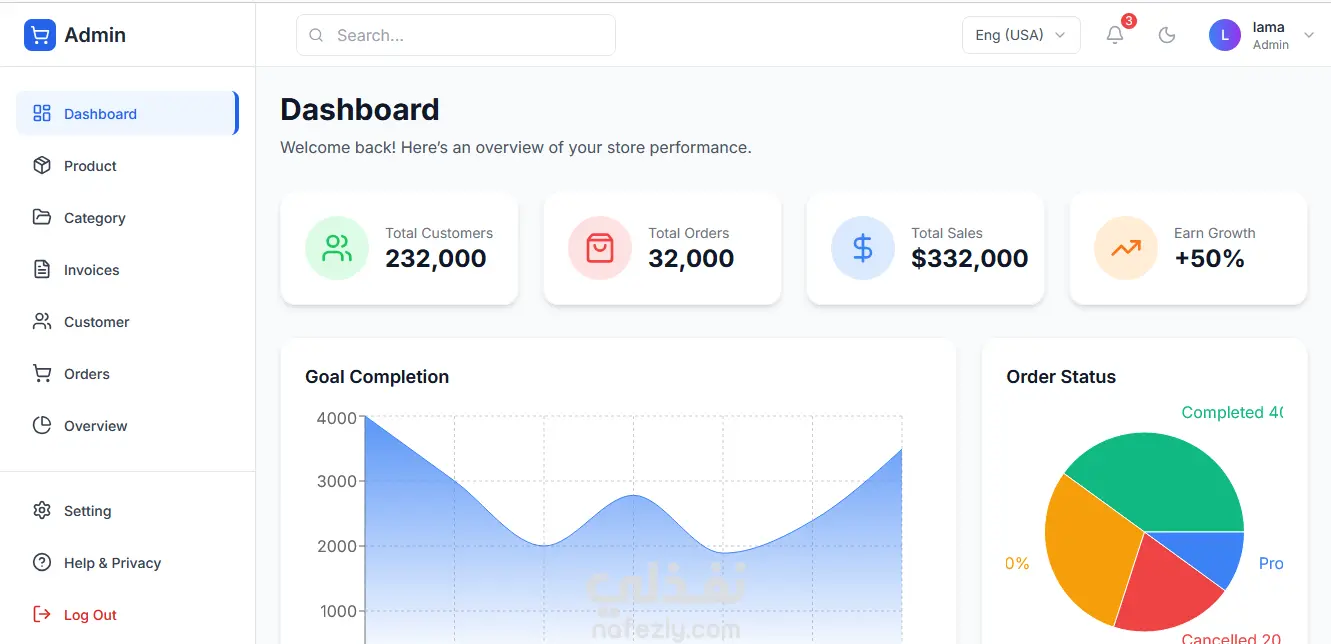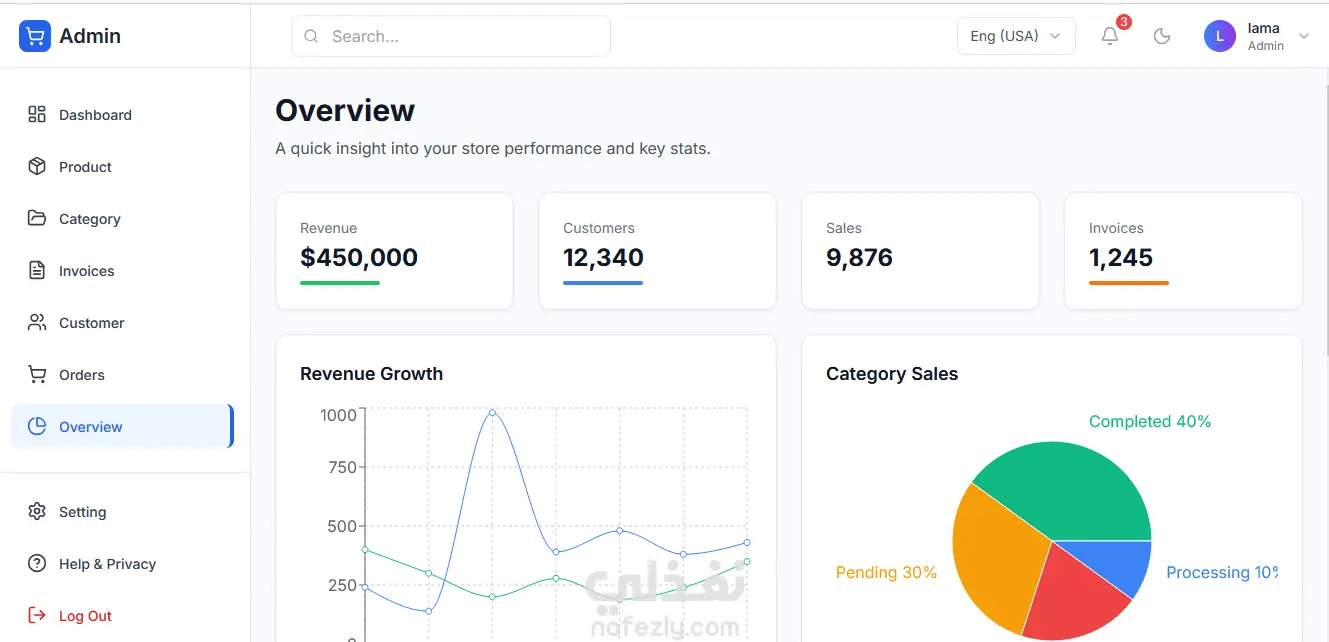 قمت بتطوير لوحة تحكم E-commerce Dashboard كاملة باستخدام Next.js و TypeScript و Tailwind CSS مع أسلوب تصميم احترافي ومناسب للأنظمة الإدارية. اللوحة توفر واجهة سهلة الاستخدام وتعرض بيانات المتجر بشكل منظم، وتشمل: - صفحة Dashboard تعرض الإحصائيات الأساسية. - إدارة المنتجات (إضافة – تعديل – حذف). - عرض الطلبات وحالتها. - صفحة العملاء. - نظام تنقل Sidebar متجاوب بالكامل. - تصميم عصري باستخدام Tailwind CSS. - رسوم بيانية باستخدام Recharts. - أنيميشن سلس باستخدام Framer Motion. - تنظيم الكود وفق معايير Clean Architecture. - أداء سريع واستجابة ممتازة عبر Next.js. المشروع يمثل نظام Admin Panel متكامل قابل للتطوير، مناسب للمتاجر الإلكترونية وأصحاب المشاريع الذين يحتاجون لوحة تحكم موثوقة وسريعة.