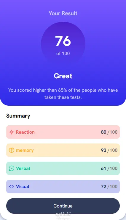 تطوير بطاقة نتائج تفاعلية بإستخدام HTML , CSS مع تصميم متجاوب يناسب جميع الشاشات , قمت بتحويل التصميم من نموذج بصري لكود نظيف مع التركيز على تطبيق التدرجات اللونية , الظلال لعرض المحتوي بطريقة واضحة وجذابة .