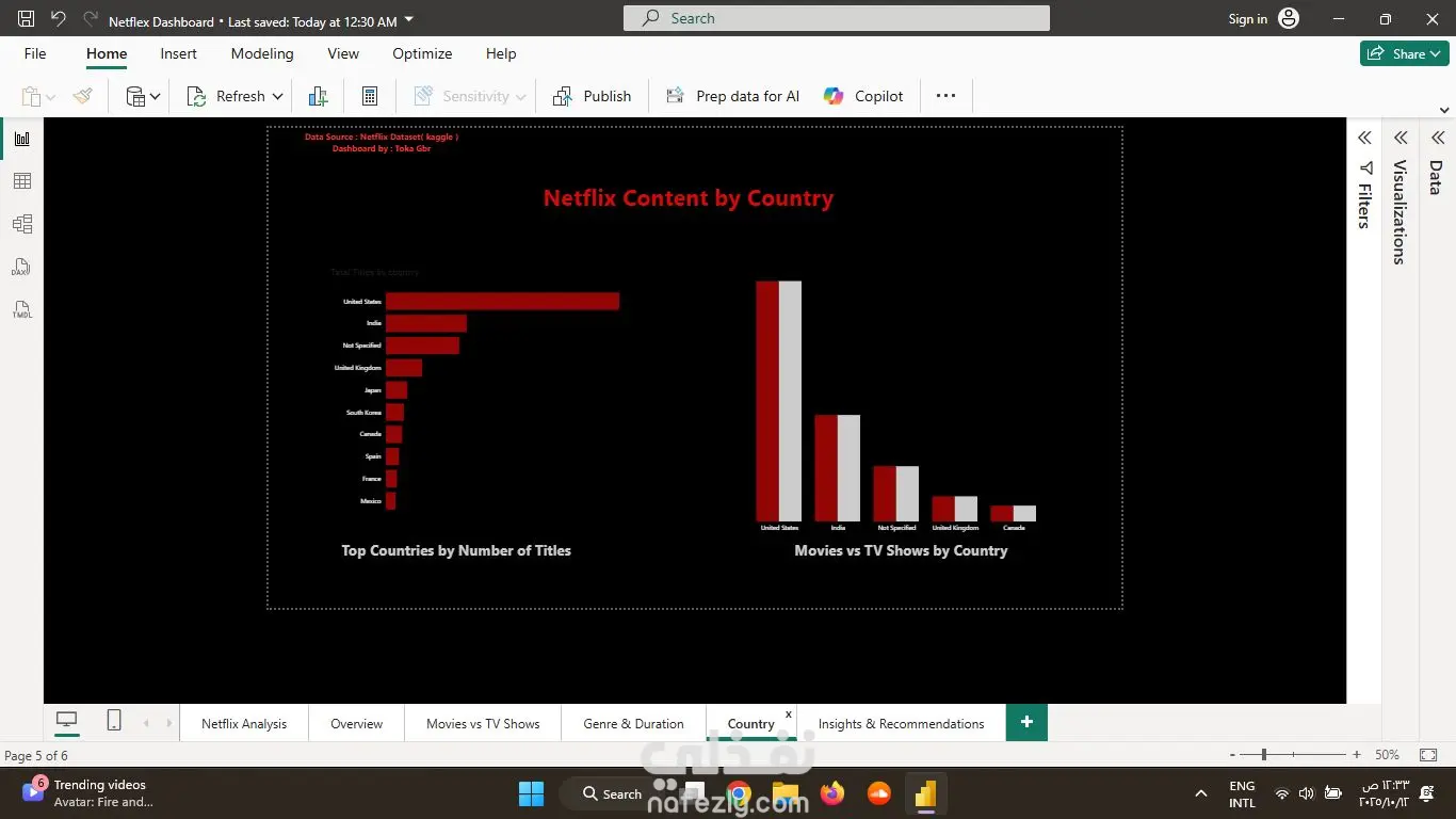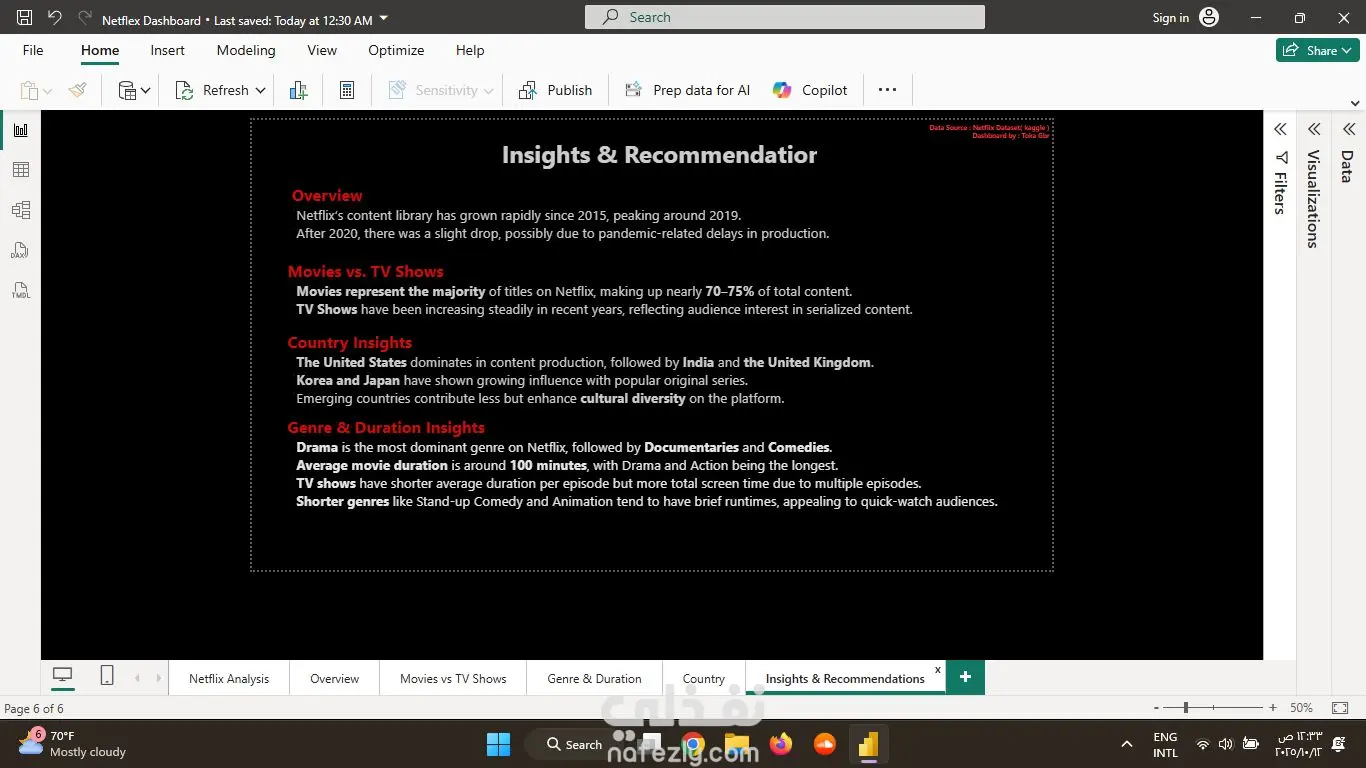 Project Overview This project explores Netflix data to analyze: Distribution of Movies vs TV Shows Content trends over the years Top countries producing content Popular genres Ratings and duration insights The goal is to demonstrate strong data analysis, visualization, and storytelling skills using Power BI. Data Cleaning & Transformation Performed in Power Query: Removed duplicates and null values Split multiple countries and genres Extracted numeric duration Standardized column names and formats Key Insights A large portion of content was released between 2017–2019. Movies dominate Netflix’s library. United States and India are leading in content production. Dramas and Comedies are the most popular genres. Tools Used Microsoft Power BI – Visualization & Dashboard Design Power Query – Data Cleaning & Transformation Excel / CSV Dataset – Data Source Disclaimer This is a demo project created for learning and portfolio purposes. It’s not affiliated with Netflix, and the dataset was obtained from a public source.
