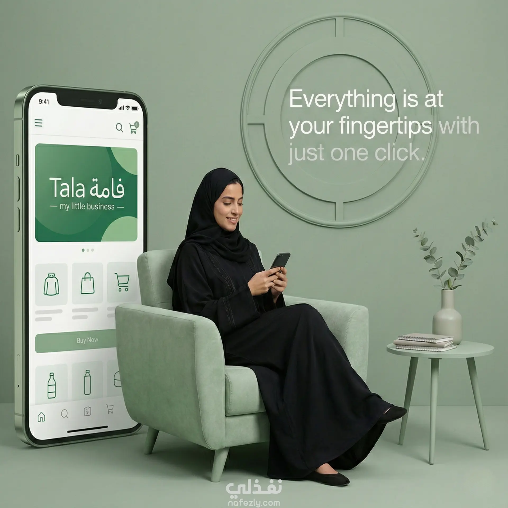 ## ⭐ **وصف دقيق جدًا للصورة (مع جعل لون الحائط أخضر)** مشهد إعلاني عصري بستايل نظيف وألوان موحّدة. تظهر امرأة ترتدي عباءة سوداء وحجابًا أسود، جالسة على كرسي مريح بلون **أخضر فاتح** داخل غرفة حديثة. خلفها حائط بلون **أخضر موحّد** مع ديكور بسيط دائري بارز بنفس الدرجة. الإضاءة ناعمة وتوزيعها متساوٍ مما يعطي إحساسًا بالاحتراف. إلى يسار المشهد يوجد مجسّم كبير لهاتف ذكي مائل قليلًا، معروض عليه واجهة موقع أو متجر إلكتروني يحمل اسم **Tala – my little business** مع لوجو بالأعلى وقسم للمنتجات. الهاتف يبدو واقعيًا ومندمجًا طبيعيًا داخل الخلفية. المرأة تنظر إلى هاتفها الحقيقي بابتسامة هادئة وكأنها تستخدم التطبيق. بجانبها طاولة صغيرة بنفس اللون الأخضر الفاتح عليها عناصر بسيطة غير واضحة. النص الإعلاني مكتوب على يمين الصورة بخط واضح باللون الأبيض والرمادي، ويقول: **"كل شيء عندك وبضغطة واحدة"** الألوان العامة للصورة منسجمة بين درجات الأخضر الفاتح والغامق، مع تباين جميل بين الملابس السوداء وعناصر الواجهة.