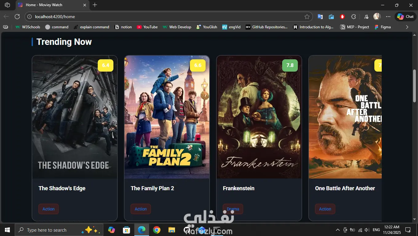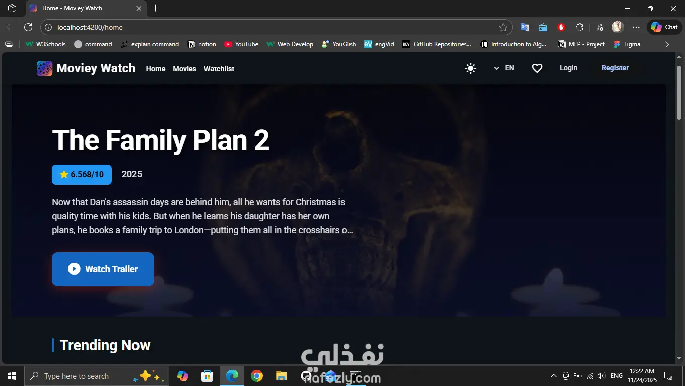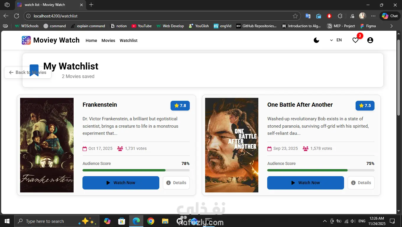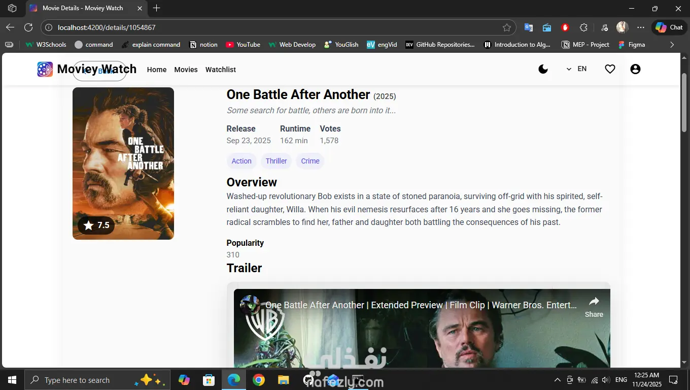 Moviey Watch – A responsive Angular movie hub using TMDB & Firebase, featuring trailers, detailed movie info, and a personal watchlist with light/dark theme support.