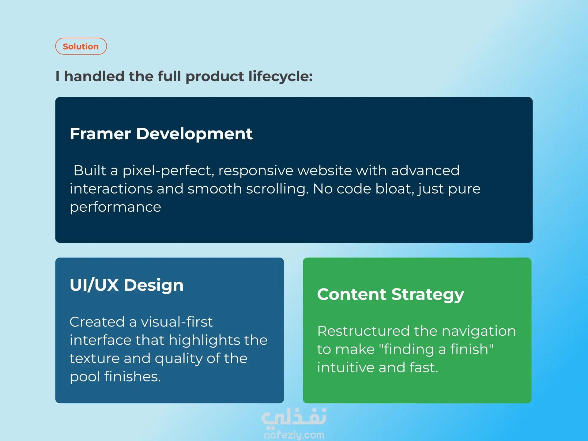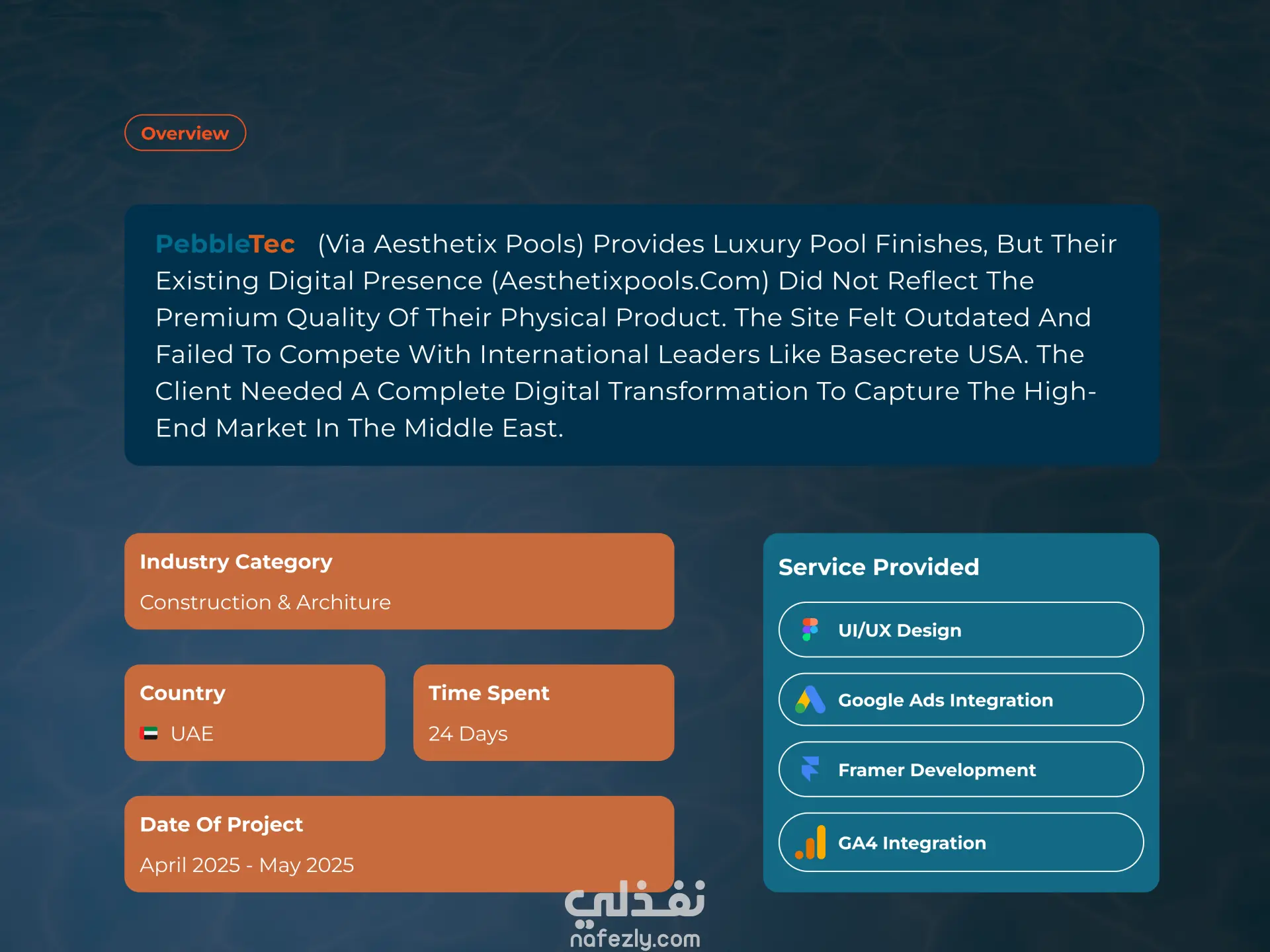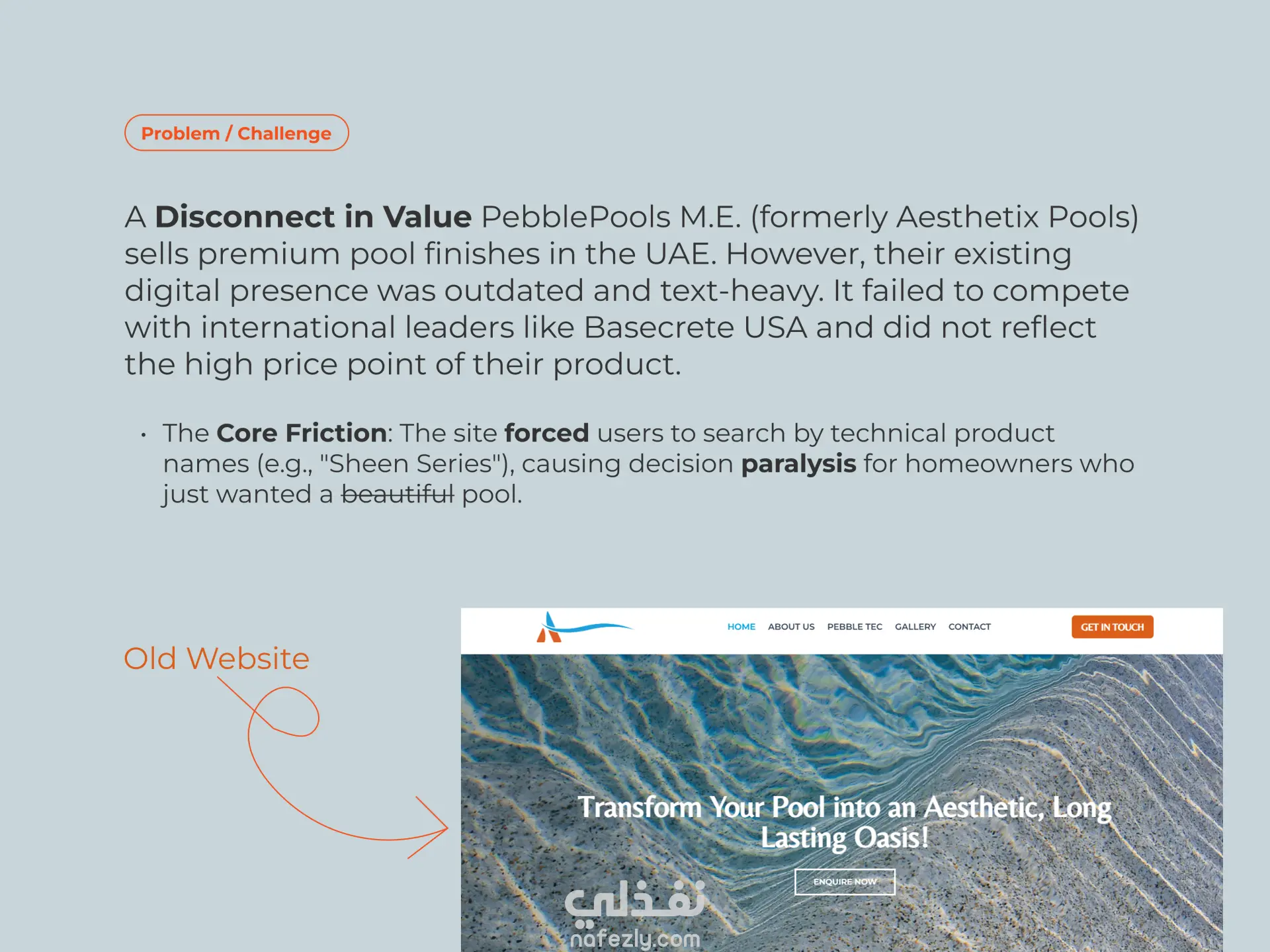 مشروع Pebble Pools كان مثالاً نموذجياً لمشروع يتطلب دمجًا بين التصميم الاستراتيجي والمهارات التقنية والتركيز على نمو الأعمال. كان الهدف تجاوز الموقع القديم الذي كان يعاني من انخفاض حاد في معدلات التحويل (Conversion Rates) وضعف في الترتيب العضوي.