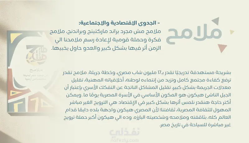 بناءً على دراسات نفسية وميدانية لسلوك الإنسان والجمهور ودراسة الفئة المستهدفة وبحث الكلمات المفتاحية المناسبة للفئة المستهدفة، قمت بصياغة نص ترويجي للعلامة التجارية "ملامح" بهدف الترويج لفكرتها وجذب المستثمرين وزيادة الوعي بالعلامة التجارية. كان النص مكتوبًا بالشكل الذي يمكن صياغته في صورة محتوى بصري جذاب ومعبر عنه. في فيديو مدته 3 دقائق تقريبًا قمت بصياغة حوالي 700 كلمة بشكل يخدم أهداف العلامة التجارية بإحترافية عالية وبإستخدام كلمات مفتاحية مؤثرة وفعالة. بيهكل كتابة إحترافي وملائم تمامًا لهدف النص، ودراسة فعلية وموسعة للفئة المستهدفة، استطعت إنجاز هذ العمل في 5 أيام وتسليمه بالشكل الذي يرضي العميل.